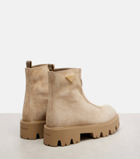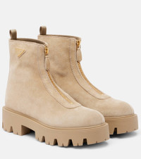 Prada embodies modern sophistication, blending timeless Italian craftsmanship with an innovative spirit. These ankle boots are crafted from suede and complete with the brand's iconic logo. Product Details - Upper: leather (suede) - Lining: leather - Sole: leather insole, rubber sole - Toe shape: round toe - Made in Italy - Includes: dust bag, shoe box - Designer color name: Neutral - Item color: beige - Hardware color: gold - Closure: zip fastening along front - Item number: P01125719 Size & Fit - True to size - European sizes - 3,5cm-1.5" platform (size EU 38) - 5cm-2" wedge heel (size EU 38)