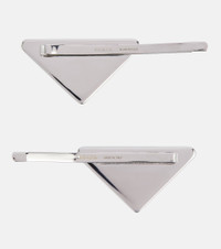 For on-brand accessorizing, consider the Symbole hair clips from Prada. They're made from metal and feature blue enamel logo plaques. Product Details - Closure: clip-on - Made in Italy - Item number: P00630233 Size & Fit - Height 2,5cm-1" - Max. width 7cm-3"