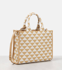 The Symbole tote bag from Prada is defined by its geometric design, accented by the brand's signature Saffiano leather trims. The style has a double handle, a removable leather keychain, and the brand's iconic triangle logo on the front. Product Details - Internal details: internal slot pocket, fabric lining, internal zipped pouch - Comes with dust bag - Designer color name: Corda+Talco - Made in Italy - Closure: open top - Trim: cow leather - Material: fabric - Detachable, adjustable shoulder strap, Top handles - Item number: P00808718 Size & Fit - Height 22cm-8.5" - Width 28cm-11" - Depth 9cm-3.5" - Length of handles 32cm-12.5" - Min. length shoulder strap 106cm-41.5" - Max. length shoulder strap 126cm-49.5"
