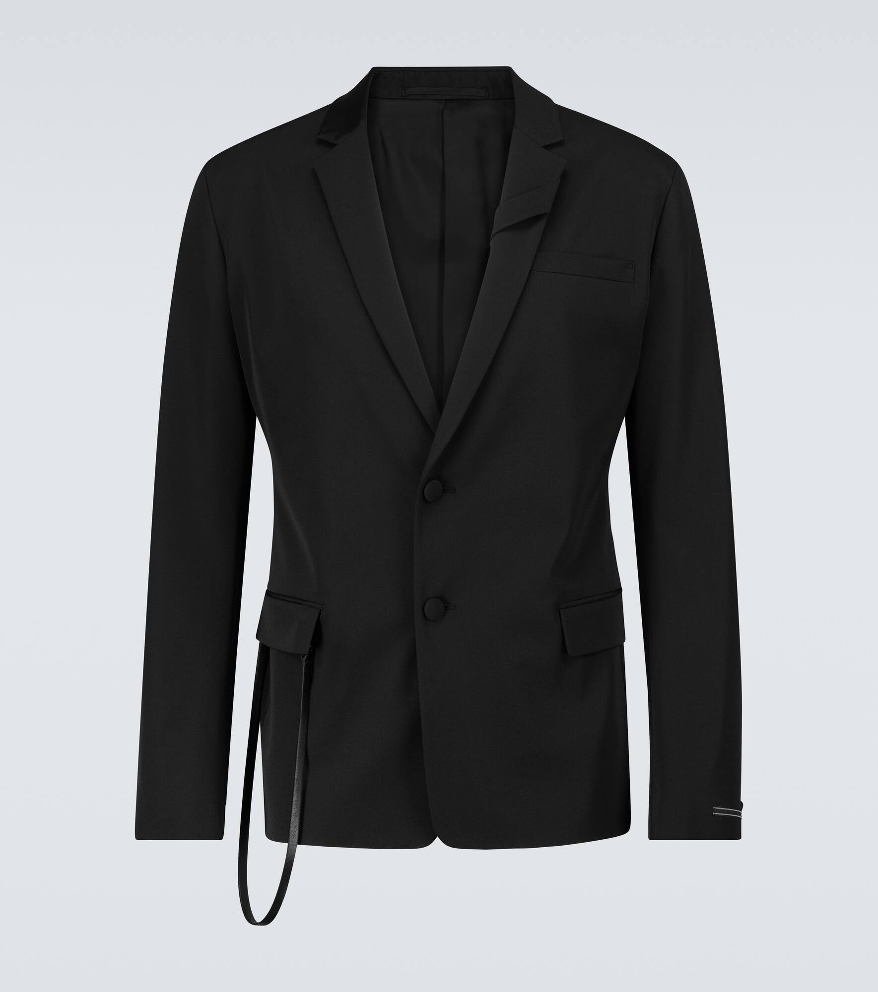 This single-breasted blazer from Prada is tailored from technical fabric in black, featuring narrow notched lapels and a leather strap on one pocket. Product Details - Made in Italy - Sleeve lining: 100% viscose - Pockets: breast pocket, flap pockets, internal pockets - Designer color name: Black - Lining: 100% cupro, fully lined - Buttoned cuffs - Material: 100% silk - Details: 100% lamb leather - Closure: buttoned front - Care instructions: dry clean - Item number: P00628594 Size & Fit - True to size - Slim fit - Falls below the hip - The model in the picture is 185cm-6'1" and wearing a size IT 48
