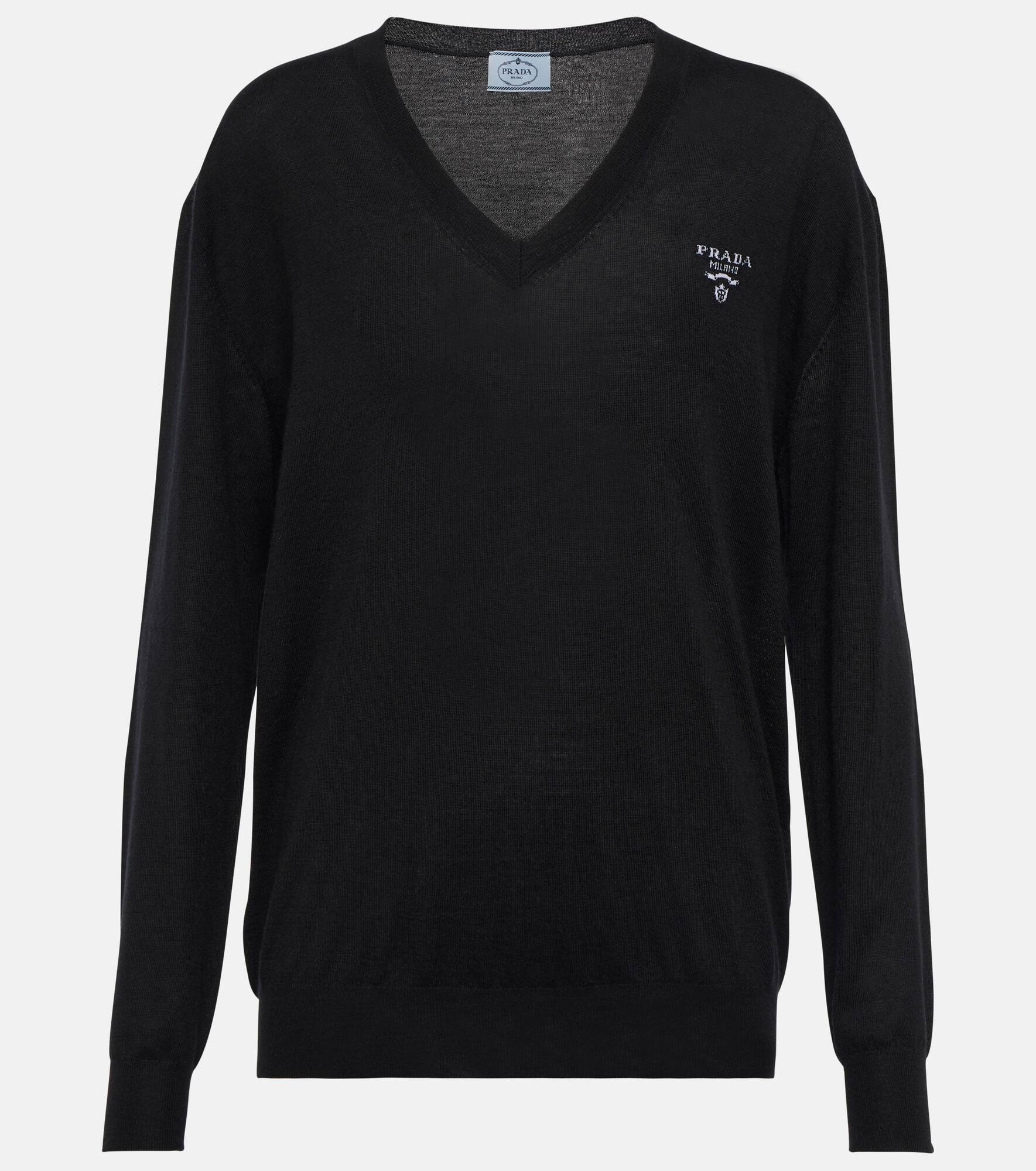 A study in minimalist elegance, this sweater from Prada has a v-neck and the label's coveted logo on the chest. Product Details - Material: 98% cashmere, 2% polyester - Care instructions: dry clean - Made in Italy - Designer color name: Nero - Item number: P00695289 Size & Fit - True to size - Dropped shoulders - Designed for a loose fit - Falls below the hip - The model seen in the picture is 178cm-5'10" and wearing a size IT 40