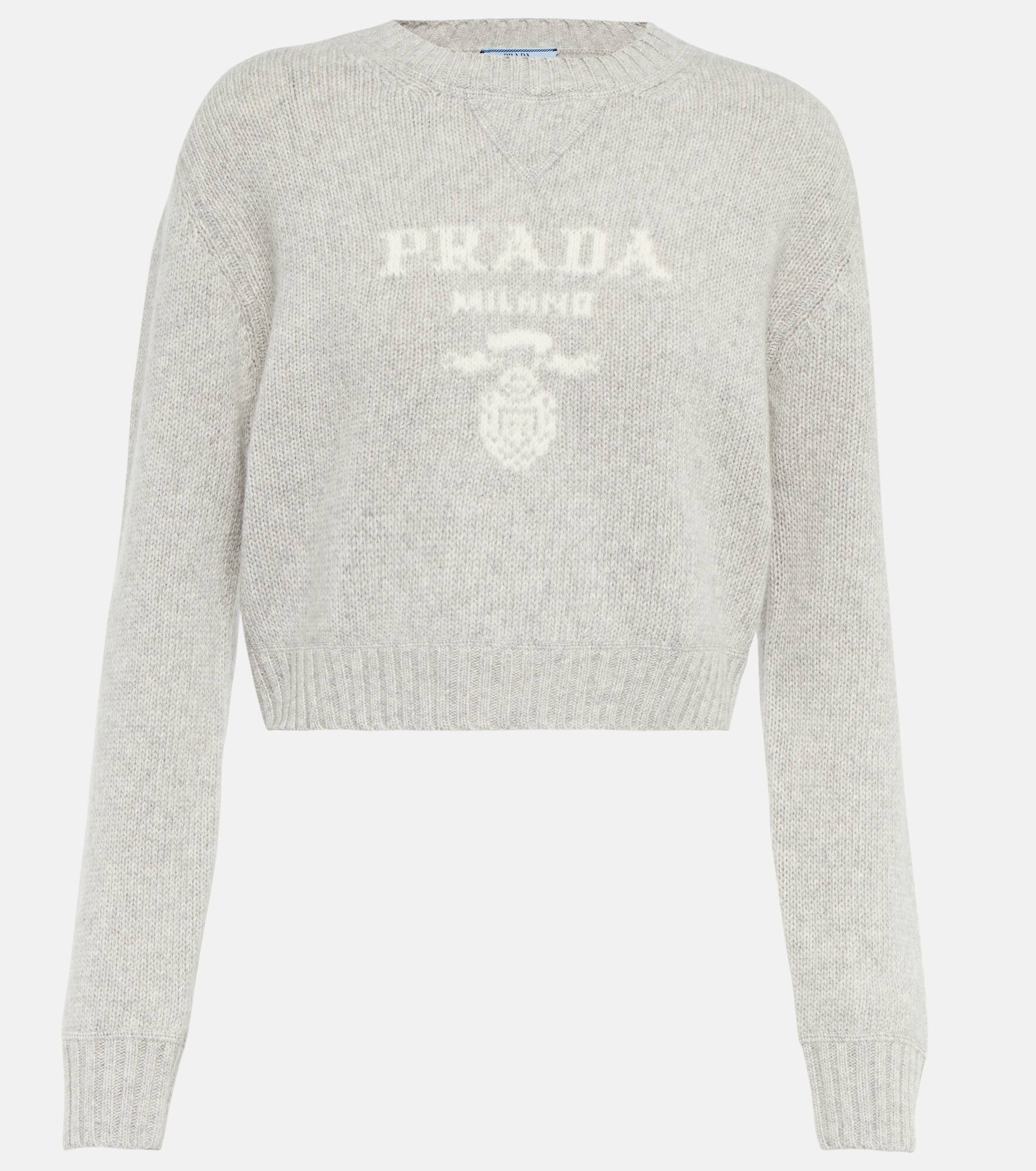This cropped sweater from Prada is made from a luxuriously cozy blend of virgin wool and cashmere. Made in Italy, the gray design features an intarsia-knit logo on the front in white. Product Details - Made in Italy - Material: 70% wool, 30% cashmere - Care instructions: dry clean - Designer color name: Marmo - Item number: P00778329 Size & Fit - True to size - Slightly cropped - The model seen in the picture is 178cm-5'10" and wearing a size IT 40