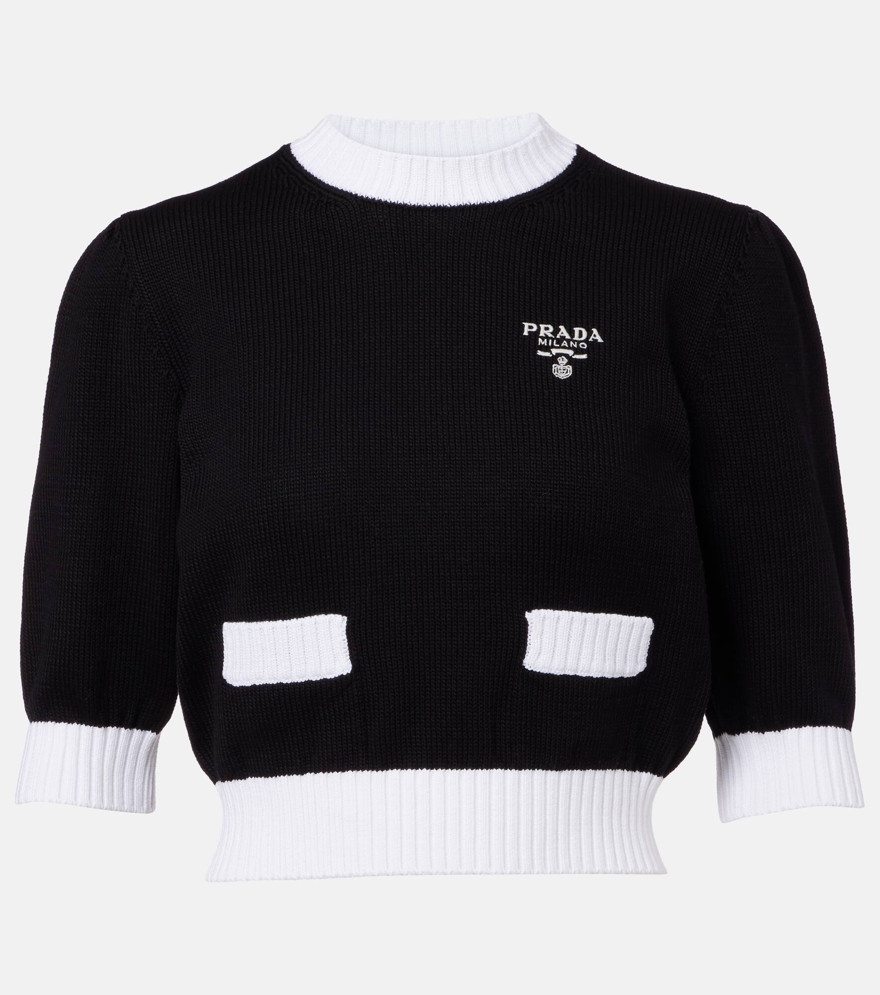 Crafted in Italy from pure cotton, this Prada waffle-knit sweater features a cropped silhouette, contrast ribbed trims, and patch pockets. A discreet embroidered logo lends a sophisticated and iconic touch. Product Details - Material: 100% cotton - Care instructions: hand wash - Made in Italy - Designer color name: Black - Item color: black, white - Sleeves: ¾ length - Collar: crewneck - Cuff: ribbed - Pockets: patch pockets - Hem: ribbed - Item number: P01068923 Size & Fit - True to size - Designed for a loose fit - Stretchy fabric - Cropped - The model seen in the picture is 178cm-5'10" and wearing a size IT 40