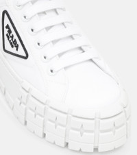 At first glance, the Wheel sneakers from Prada appear to be everyday trainers; upon closer inspection, you'll notice their ridged rubber outsole that references motorcross tires. Made in Italy from white cotton gabardine, they're quietly subversive in a characteristically Prada way. Product Details - Lining: leather - Upper: fabric - Sole: leather insole, rubber sole - Toe shape: round toe - Comes with a box - Designer color name: Bianco - Closure: lace-up - Made in Italy - Item number: P00492590 Size & Fit - True to size - European sizes - 5,5cm-2" platform (size EU 38)