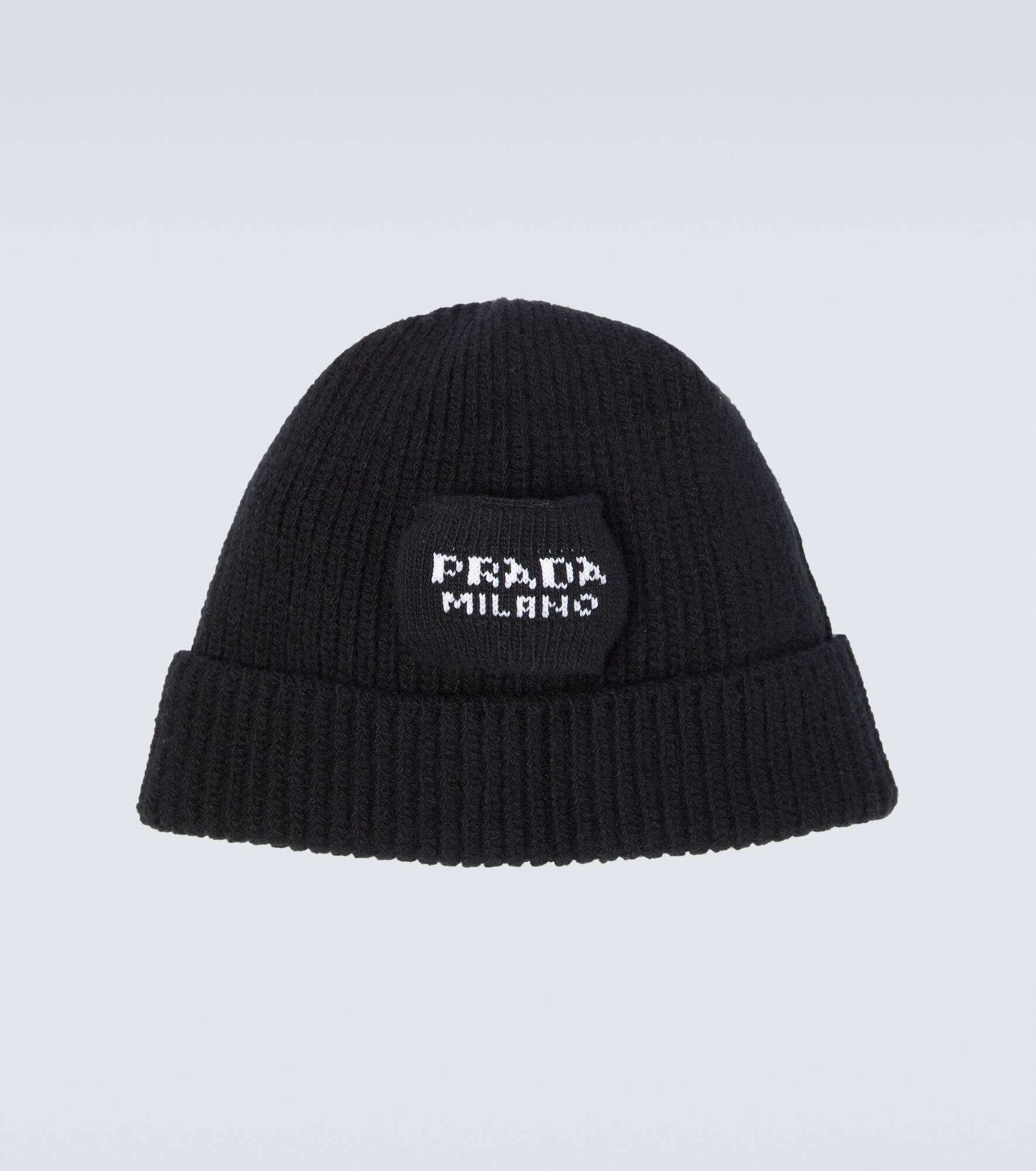 This wool and cashmere-blend beanie from Prada comes in black, and is knit in a ribbed stitch with a slight stretch, featuring an intarsia logo patch at the front and a turn-up cuff. Product Details - Material: 62% wool, 24% cashmere, 7% polyamide, 5% polyester, 2% elastane - Care instructions: dry clean - Made in Italy - Item number: P00554306
