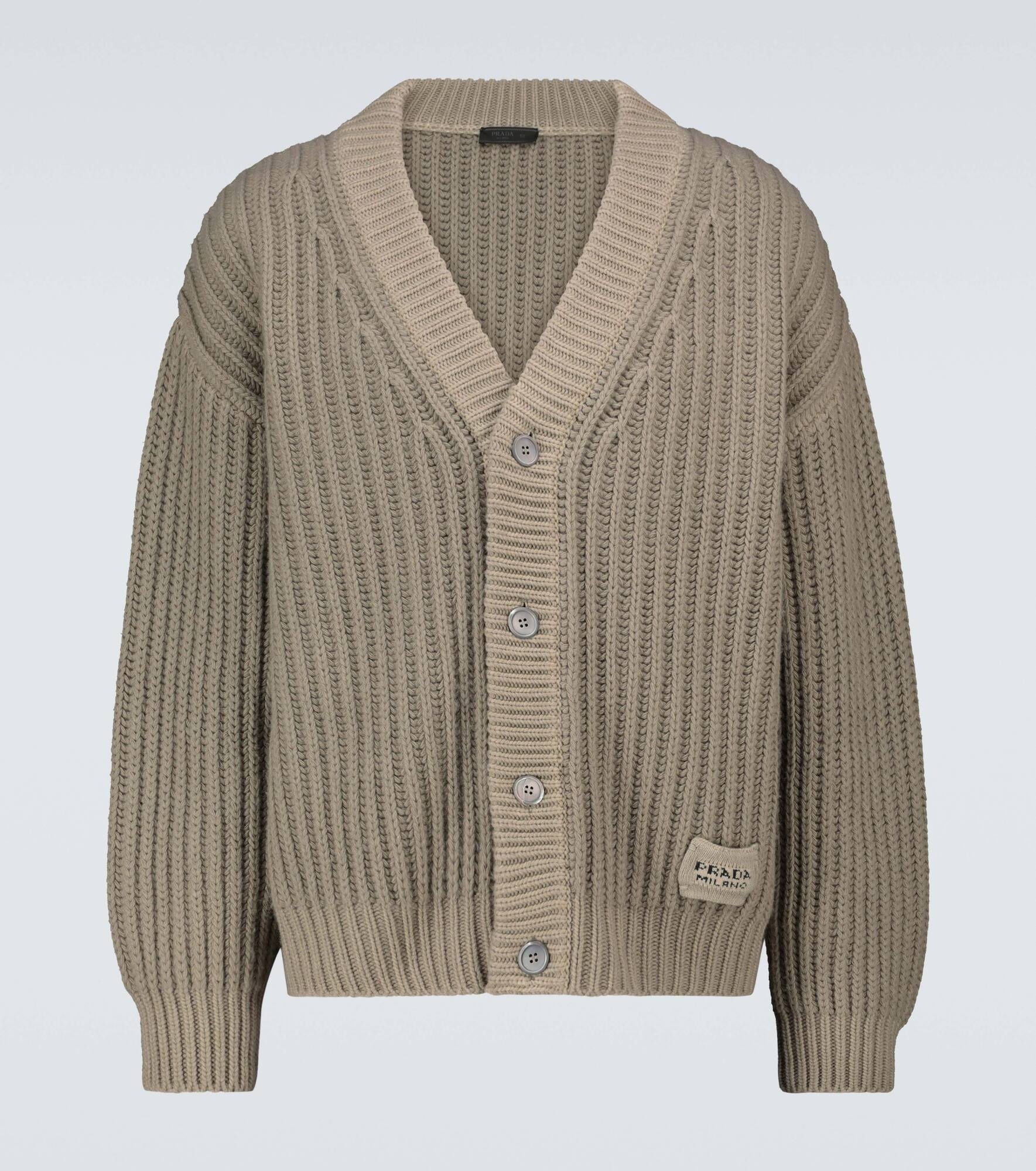 Crafted in Italy from a cashmere and wool-blend, this relaxed-fit cardigan from Prada features a buttoned front closure, a ribbed finish, and a logo patch at the hem. Product Details - Material: 70% wool, 30% cashmere - Made in Italy - Closure: buttoned front - Designer color name: Alluminum - Care instructions: dry clean - Item number: P00521891 Size & Fit - True to size - Dropped shoulders - Designed for a loose fit - Falls to the hip - The model in the picture is 185cm-6'1" and wearing a size IT 48