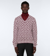 Knit from a soft wool, cashmere and technical blend, this burgundy and white sweater from Prada is made in Italy with a classic V-neckline. It features an all-over geometric jacquard pattern and is finished with ribbed trims. Product Details - Material: 69% wool, 29% cashmere, 2% polyamide - Care instructions: dry clean - Made in Italy - Designer color name: Bordeaux+Bianco - Item number: P00581320 Size & Fit - True to size - Designed for a loose fit - Falls to the hip - The model in the picture is 185cm-6'1" and wearing a size IT 48
