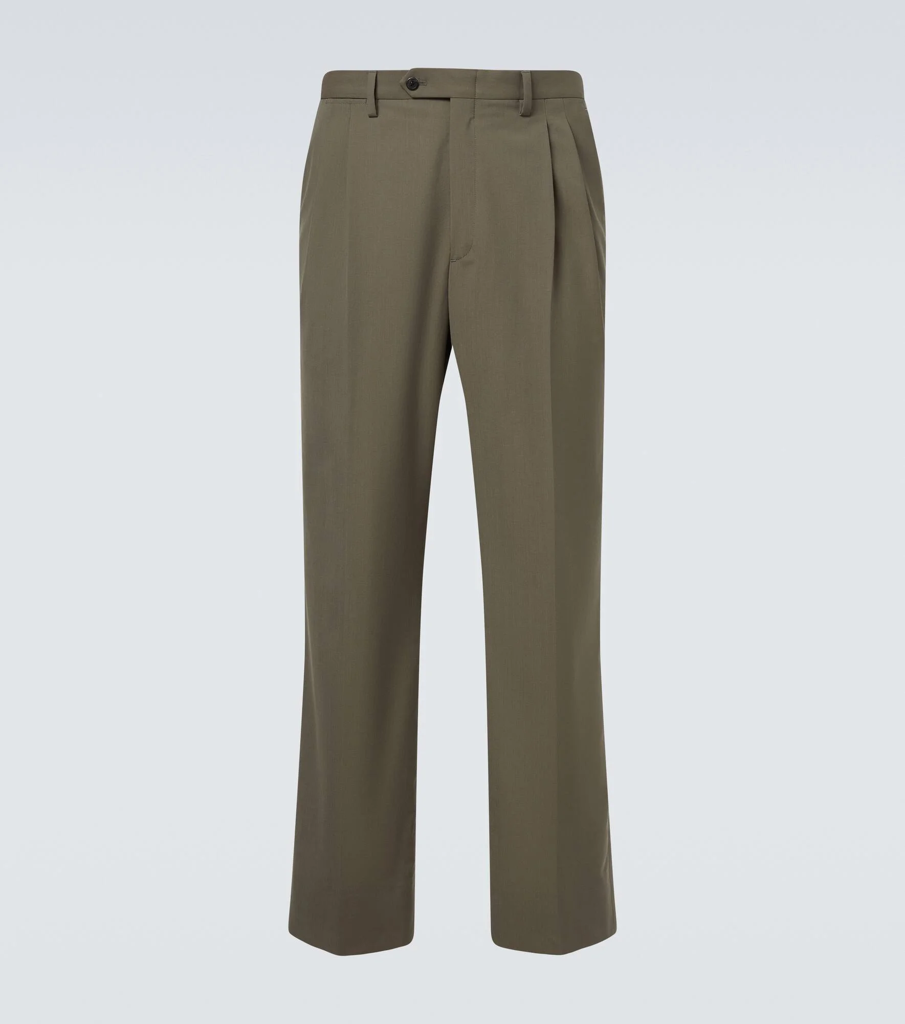 These straight-leg pants from Prada are made in Italy from wool and cotton. The pair features clean lines, subtle front pleats, and a mid-rise silhouette. Product Details - Material: 55% wool, 45% cotton - Care instructions: dry clean - Made in Italy - Color: green - Designer color name: Green - Lining: 100% viscose - Pocket lining: 100% cotton - Contains non-textile parts of animal origin - Belt loops - Closure: zipper fly, button and hook fastenings - Item number: P01145481 Size & Fit - Height of model is 189cm-74.5" and wears a size 50