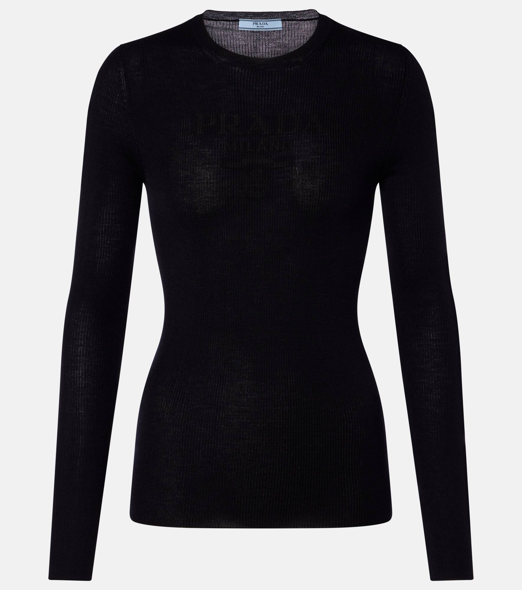 Prada takes Italian heritage into a distinctly modern direction with a streamlined and fashion-forward approach. This sweater is crafted from a soft wool and silk blend and designed with a close-fitting silhouette for ultimate coverage. Product Details - Material: 93% wool, 5% silk, 1% polyamide, 1% elastane - Care instructions: dry clean - Made in Italy - Designer color name: Blu - Item color: blue - Collar: crewneck - Item number: P01061913 Size & Fit - True to size - Fitted - Stretchy fabric - Falls below the hip - The model seen in the picture is 178cm-5'10" and wearing a size IT 40