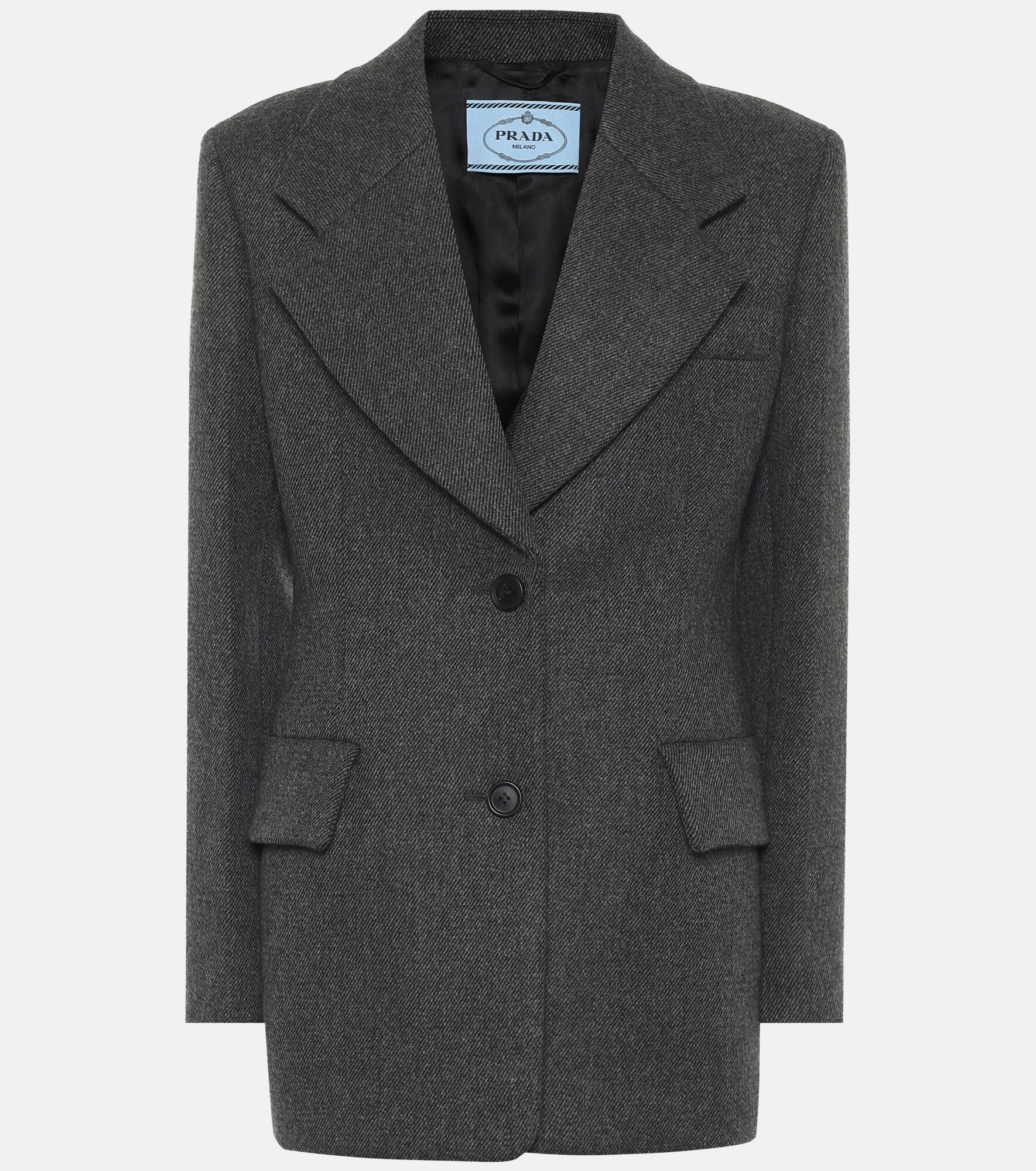 Dressing for work never means having to minimize personality with this wool blazer from Prada. In a dark grey hue, the classic style is infused with subversive details such as wide lapels and a sharply structured waist. Continue the strong silhouette with a fitted pencil skirt and stilettos. Product Details - Made in Italy - Material: 100% virgin wool - Pockets: breast pocket, flap pockets - Designer color name: Grey - Lining: 100% viscose, fully lined - Closure: buttoned front - Care instructions: dry clean - Buttoned cuffs - Shoulder pads - Item number: P00513052 Size & Fit - True to size - Oversized shoulders - Shoulder pad inserts - Cinched waist - Falls below the hip - The model seen in the picture is 178cm-5'10" and wearing a size IT 40