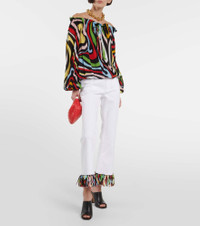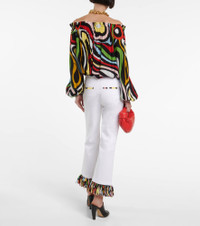 For a refresh on your warm-weather edit, look to Pucci whose specialty is vivid hues and designs that emulate Italian opulence. These high-rise pants are made from stretchy cotton with cropped legs and colorful trims. Product Details - Made in Italy - Insert: 100% polyester - Material: 1% elastane, 99% cotton - Designer color name: Bianco - Pockets: back pockets, side slit pockets - Closure: zipper fly, button fastening - Trim: 100% silk - Care instructions: dry clean - Item number: P00769580 Size & Fit - True to size - Mid-weight material - Slim-leg with a flared hem - The model seen in the picture is 178cm-5'10" and wearing a size IT 40 - Length of fringe 8cm-3"