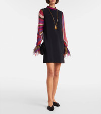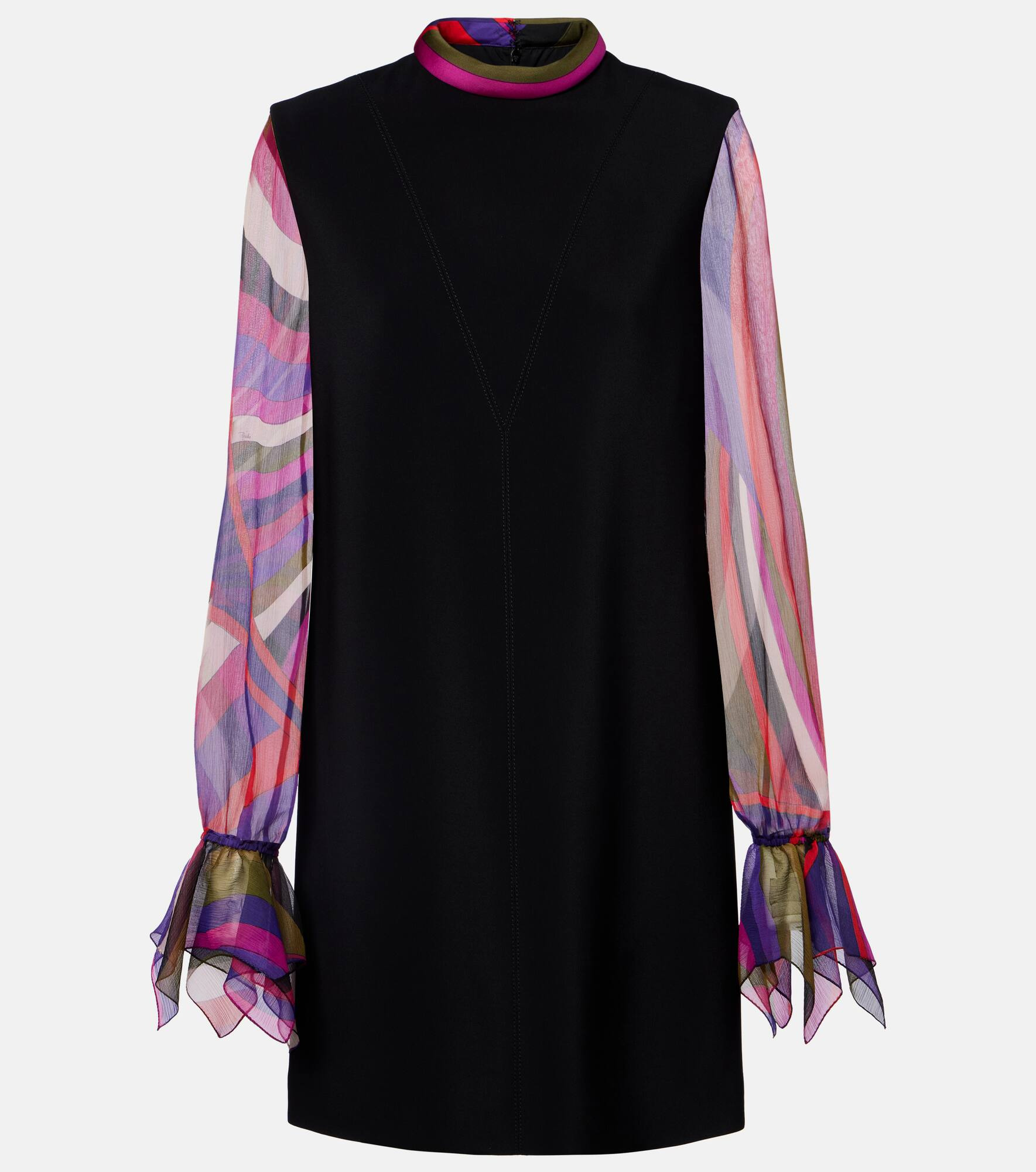 Classic with a twist, this cady minidress from Pucci features a minimalist silhouette and is finished with sheer sleeves cuffed at the wrists and a satin mock neck. The iconic psychedelic swirling motif is a brand signature, which earned Pucci the title "Prince of Prints". Product Details - Material: 96% viscose, 4% elastane - Care instructions: dry clean - Made in Italy - Designer color name: Nero - Item color: multicolor - Material II: 100% silk - Material III: 100% silk - Lining: 67% acetate, 33% polyester - Cuff: elasticated, ruffled - Closure: concealed zipped back, hook fastening - Each piece is unique and prints may differ slightly from those shown - Item number: P01110715 Size & Fit - True to size - Straight fit - Non-stretchy fabric - The model seen in the picture is 178cm-5'10" and wearing a size IT 40