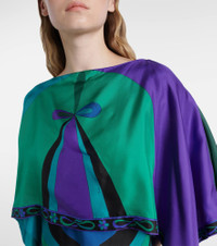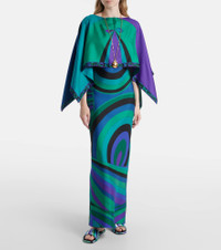 The iconic psychedelic swirling motif is a brand signature, which earned Pucci the title "Prince of Prints." The Iride silk maxi dress is made in Italy and features a dramatic cape detail, offering a striking, fluid silhouette with bold print allure. Product Details - Material: 100% silk - Care instructions: dry clean - Made in Italy - Designer color name: Smeraldo - Item color: multicolor - Material II: 100% silk - Each piece is unique and prints may differ slightly from those shown - Item number: P01034918 Size & Fit - Fits large to size - we recommend trying one size smaller - Cinched waist - Loose outer layer - Non-stretchy fabric - slit length 57,0cm-22.5" - The model seen in the picture is 178cm-5'10" and wearing a size IT 38