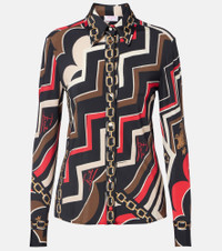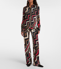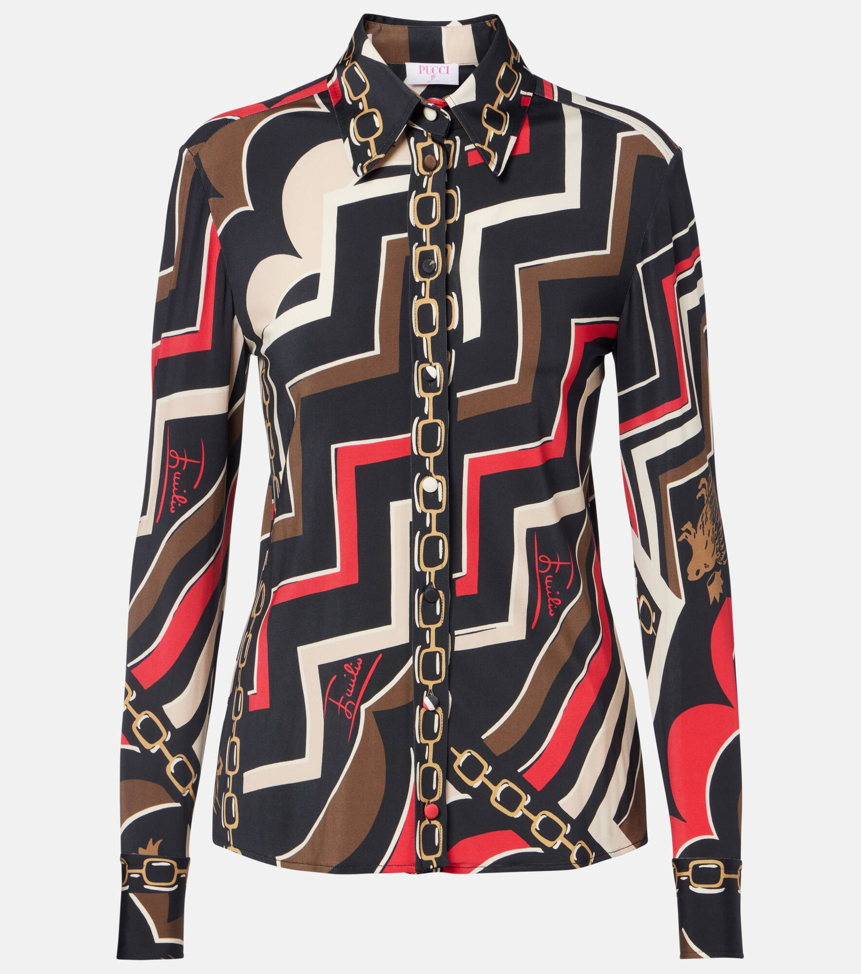 The iconic psychedelic swirling motif is a brand signature, which earned Pucci the title "Prince of Prints". Featuring the house's Istrice pattern, this shirt is made from shiny satin jersey and is complete with a pointed collar. Product Details - Material: 95% viscose, 5% elastane - Care instructions: dry clean - Made in Italy - Designer color name: Gold Red - Item color: multicolor - Collar: classic (Straight point) - Cuff: buttoned - Closure: buttoned front - Item number: P01111038 Size & Fit - True to size - Cinched waist - Stretchy fabric - Falls below the hip - The model seen in the picture is 178cm-5'10" and wearing a size IT 40
