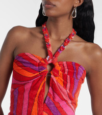 This vibrant minidress from Pucci is made from soft cotton terry and boasts the house's Marmo motif. The design features slim straps that tie around the neck, embroidered by hand with sequins and triangle-shaped embellishments. Product Details - Material: 100% cotton - Care instructions: dry clean - Made in Italy - Designer color name: Corallo/Fuxia - Item color: multicolor - Trim: 100% silk - Item number: P01034950 Size & Fit - Fits small to size - we recommend trying one size larger - Cinched waist - Non-stretchy fabric - The model seen in the picture is 178cm-5'10" and wearing a size IT 42