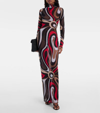 The iconic psychedelic swirling motif is a brand signature, which earned Pucci the title "Prince of Prints". This maxi dress features tulle ruffles and comfortable jersey construction. Product Details - Material: 100% polyamide - Care instructions: machine wash at 30 degrees - Made in Italy - Designer color name: Gold Red - Item color: multicolor - Collar: mockneck - Cuff: ruffled - Each piece is unique and prints may differ slightly from those shown - Item number: P01111036 Size & Fit - True to size - Sheer - Fitted - Stretchy fabric - The model seen in the picture is 178cm-5'10" and wearing a size IT 40