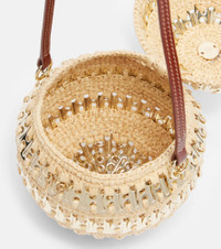 Woven from natural raffia and embellished with rows of signature 1969 discs, this shoulder bag from Rabanne features a playful, spherical shape. The style comes with a slim strap in supple leather. Product Details - Material: raffia, metal - Lining: unlined - Made in Madagascar - Designer color name: Natural / LightGold - Item color: beige - Top handle - Item number: P01038706 Size & Fit - Height 15cm-6" - Diameter 12cm-4.5" - Length of handles 50cm-19.5"