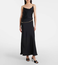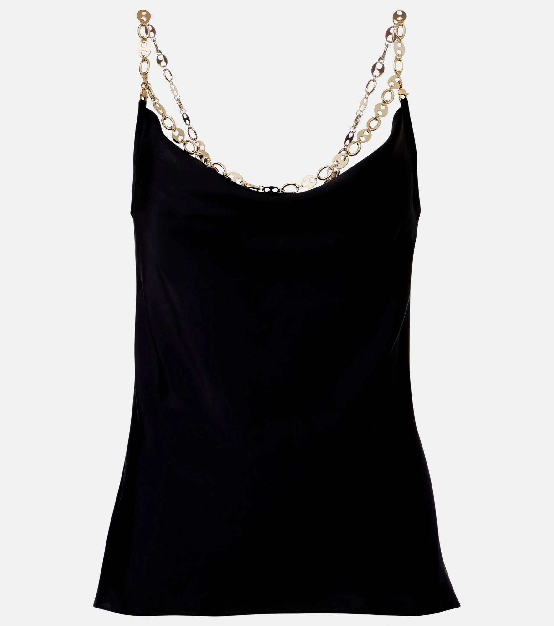 Celebrated for creating glamorous designs with unexpected materials, Rabanne’s innovative spirit continues to break boundaries. This top is tailored to a loose silhouette with chain shoulder straps that add a bold touch. Product Details - Material: 100% polyester - Care instructions: machine wash at 30 degrees - Made in Tunisia - Color: black - Designer color name: Black - Item color: black - Hardware color: gold - Detachable chain - Item number: P01115812 Size & Fit - True to size - Cinched waist - Non-stretchy fabric - Falls to the hip - The model seen in the picture is 178cm-5'10" and wearing a size FR 34