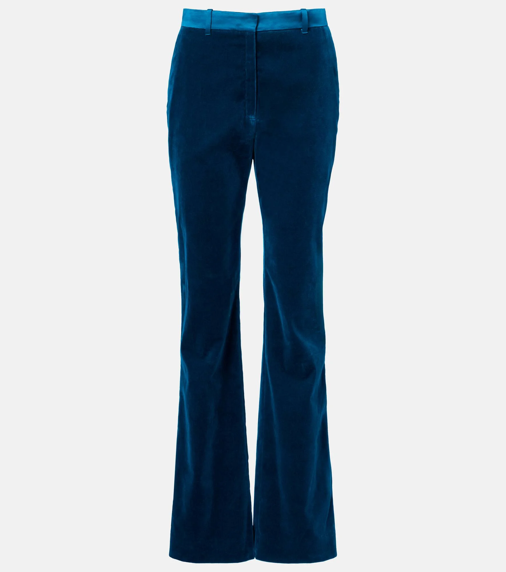 These Rabanne pants are crafted from a soft cotton-blend velvet. The style feature a flared silhouette with a contrasting satin waistband, completed by side slits, back pockets and belt loops. Product Details - Material: 91% cotton, 7% polyester, 2% elastane - Care instructions: dry clean - Made in Poland - Color: blue - Designer color name: Blue Bird - Item color: blue - Closure: zipper fly, button and hook fastenings - Belt loops - Pockets: side slit pockets, back pockets - Item number: P01115821 Size & Fit - Fits small to size - we recommend trying one size larger - Non-stretchy fabric - Bootcut - The model seen in the picture is 178cm-5'10" and wearing a size FR 36