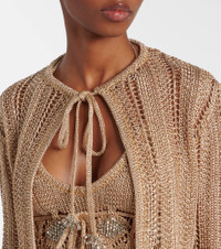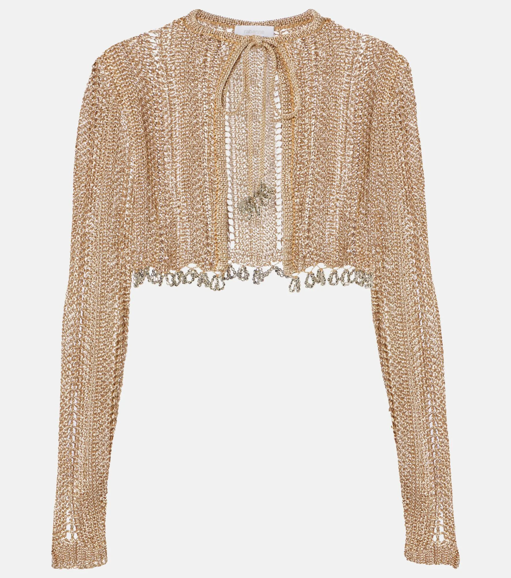 This crocheted cardigan from Rabanne is embellished with silver bead embroidery. The piece features a cropped length and is finished with self-ties at the neck for closure. Product Details - Material: 73% viscose, 14% metallic fibres, 13% paper - Care instructions: dry clean - Made in China - Designer color name: Light Gold - Item color: gold, silver - Self-tie collar - Item number: P01058804 Size & Fit - True to size - Semi-sheer - Designed for a loose fit - Non-stretchy fabric - Cropped - The model seen in the picture is 178cm-5'10" and wearing a size XS