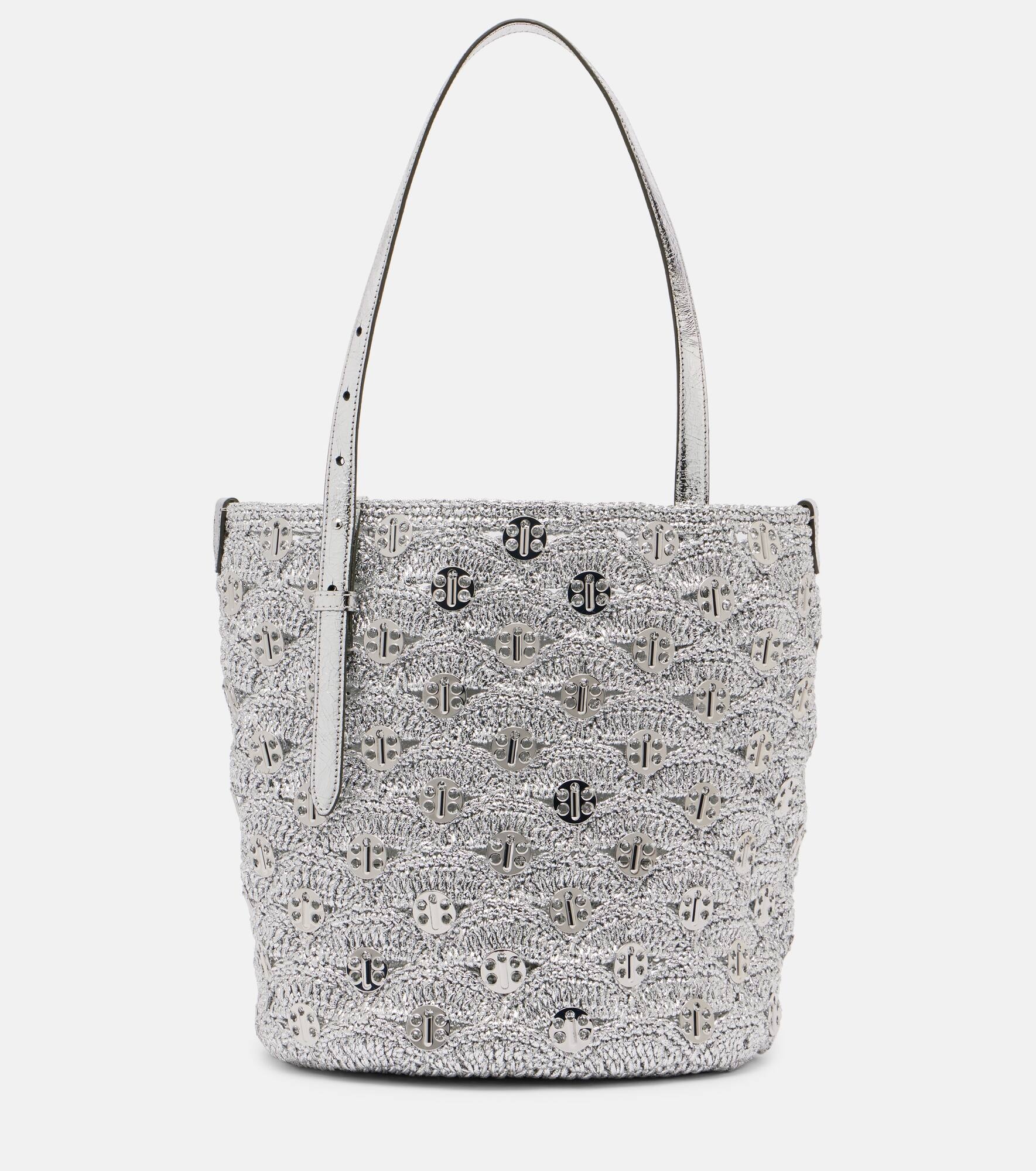 Celebrated for creating glamorous designs with unexpected materials, Rabanne’s innovative spirit continues to break boundaries. Made from lame raffia, this tote bag is embellished throughout and has adjustable metallic leather handles. Product Details - Material: fabric - Lining: unlined - Made in Madagascar - Designer color name: Silver - Item color: silver - Includes: dust bag - Item number: P01026090 Size & Fit - Height 27cm-10.5" - Width 26cm-10" - Depth 22cm-8.5" - Length of handle 62cm-24.5"