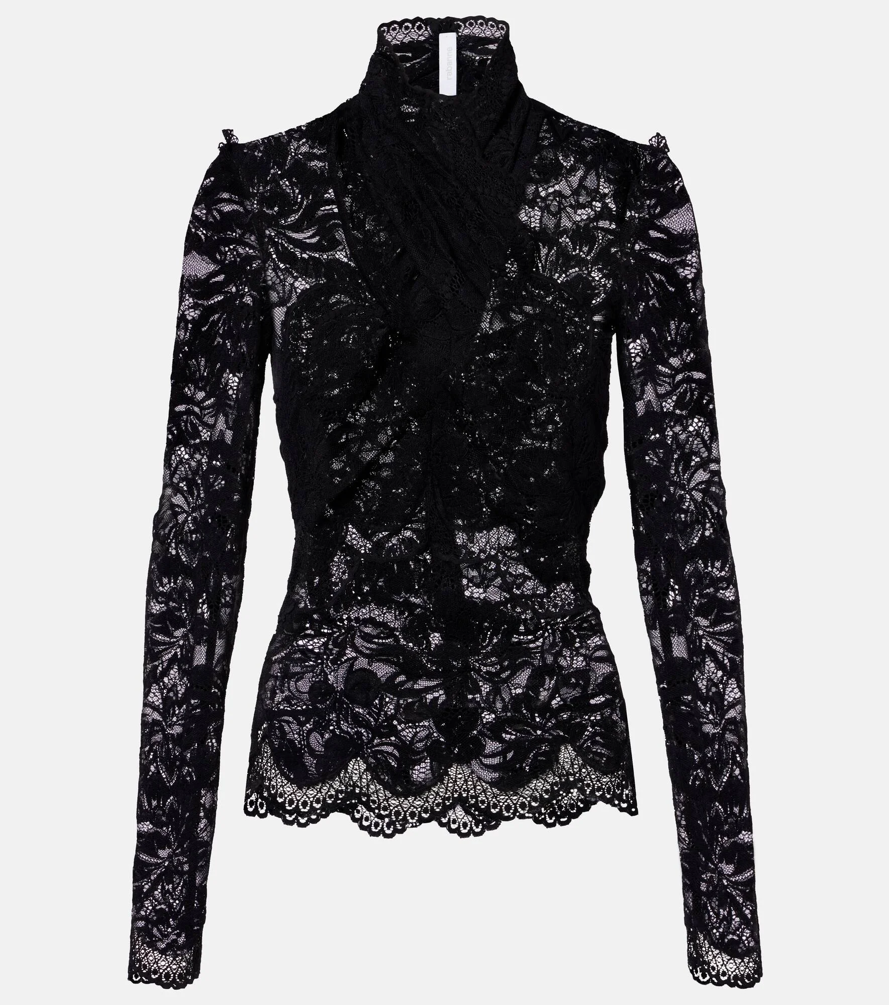 Celebrated for creating glamorous designs with unexpected materials, Rabanne’s innovative spirit continues to break boundaries. This semi-sheer top is crafted from stretch lace with an all-over floral pattern and features a layered criss-cross detail at the collar. Product Details - Material: 90% polyamide, 10% elastane - Care instructions: dry clean - Made in Poland - Color: black - Designer color name: Black - Item color: black - Closure: invisible zipper - Item number: P01115750 Size & Fit - True to size - Semi-sheer - Fitted - Stretchy fabric - Falls to the hip - The model seen in the picture is 178cm-5'10" and wearing a size FR 34