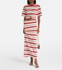 Celebrated for creating glamorous designs with unexpected materials, Rabanne’s innovative spirit continues to break boundaries. Made from an elasticated cotton blend, this striped maxi skirt features a gathered side, creating a slit. Product Details - Material: 96% cotton, 4% elastane - Care instructions: machine wash at 30 degrees - Made in Portugal - Designer color name: Stripes Cream/Orange - Item color: white, multicolor - Elasticated waistband - Long vent - Item number: P01058783 Size & Fit - True to size - Elasticated waist - Stretchy fabric - The model seen in the picture is 178cm-5'10" and wearing a size FR 34
