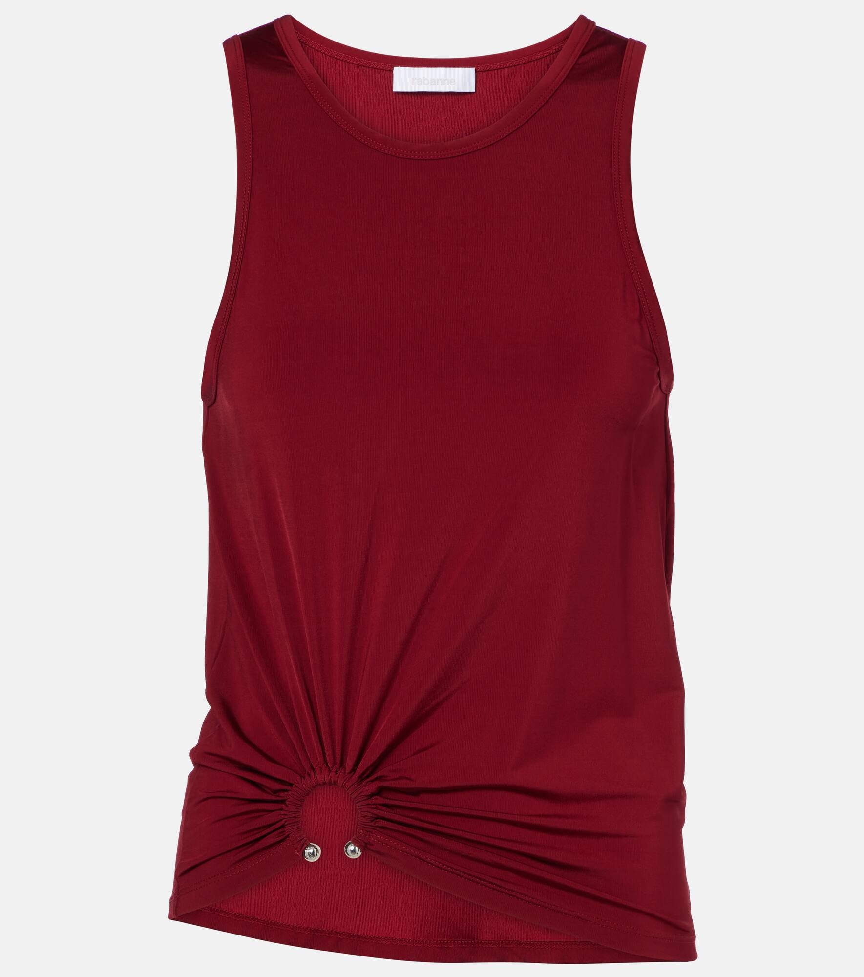 This tank top from Rabanne is made from a smooth jersey fabric. An elevated essential for your collection, the style is finished with the brand's piercing detailing on one side. Product Details - Material: 90% viscose, 10% elastane - Care instructions: dry clean - Made in Portugal - Designer color name: Ruby Red - Item color: red - Item number: P01058796 Size & Fit - True to size - Cinched waist - Stretchy fabric - Slightly cropped - The model seen in the picture is 178cm-5'10" and wearing a size FR 36