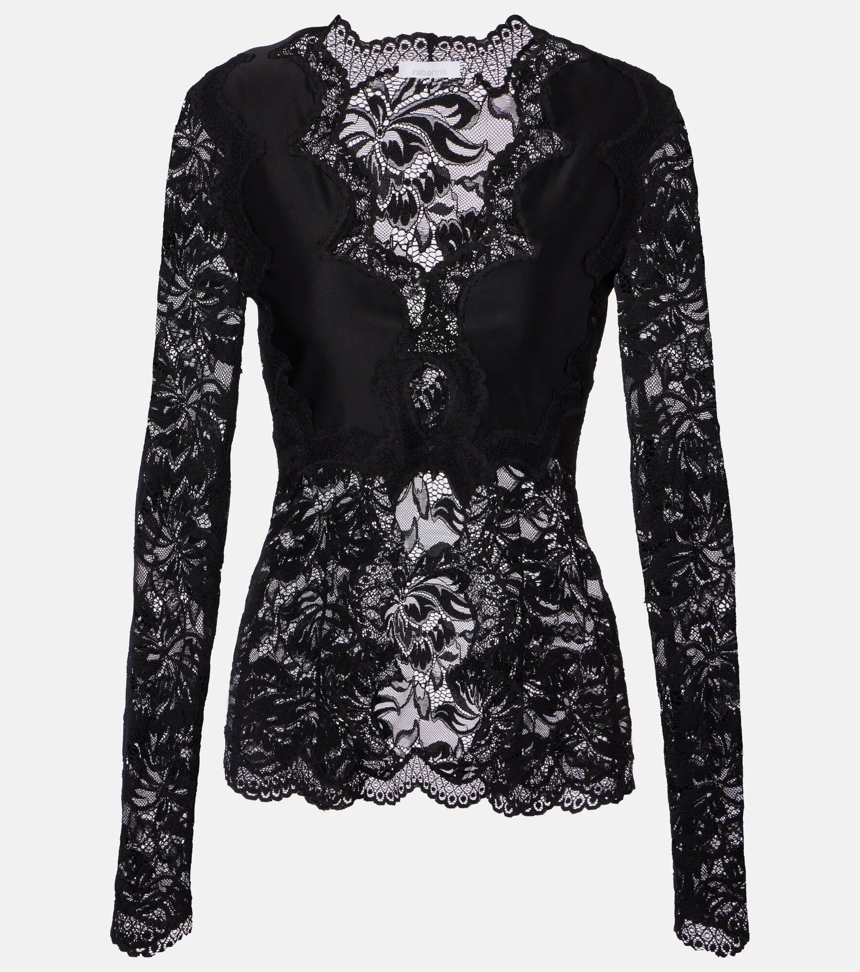 This Rabanne top has been crafted from floral lace and features a long-sleeved, tight silhouette. A scalloped V-neckline brings a refined touch to this piece. Product Details - Material: 76% polyamide, 14% viscose, 10% elastane - Care instructions: dry clean - Made in Poland - Designer color name: Black - Item color: black - Item number: P01119629 Size & Fit - True to size - Semi-sheer - Fitted - Stretchy fabric - Falls to the hip - The model seen in the picture is 178cm-5'10" and wearing a size FR 34