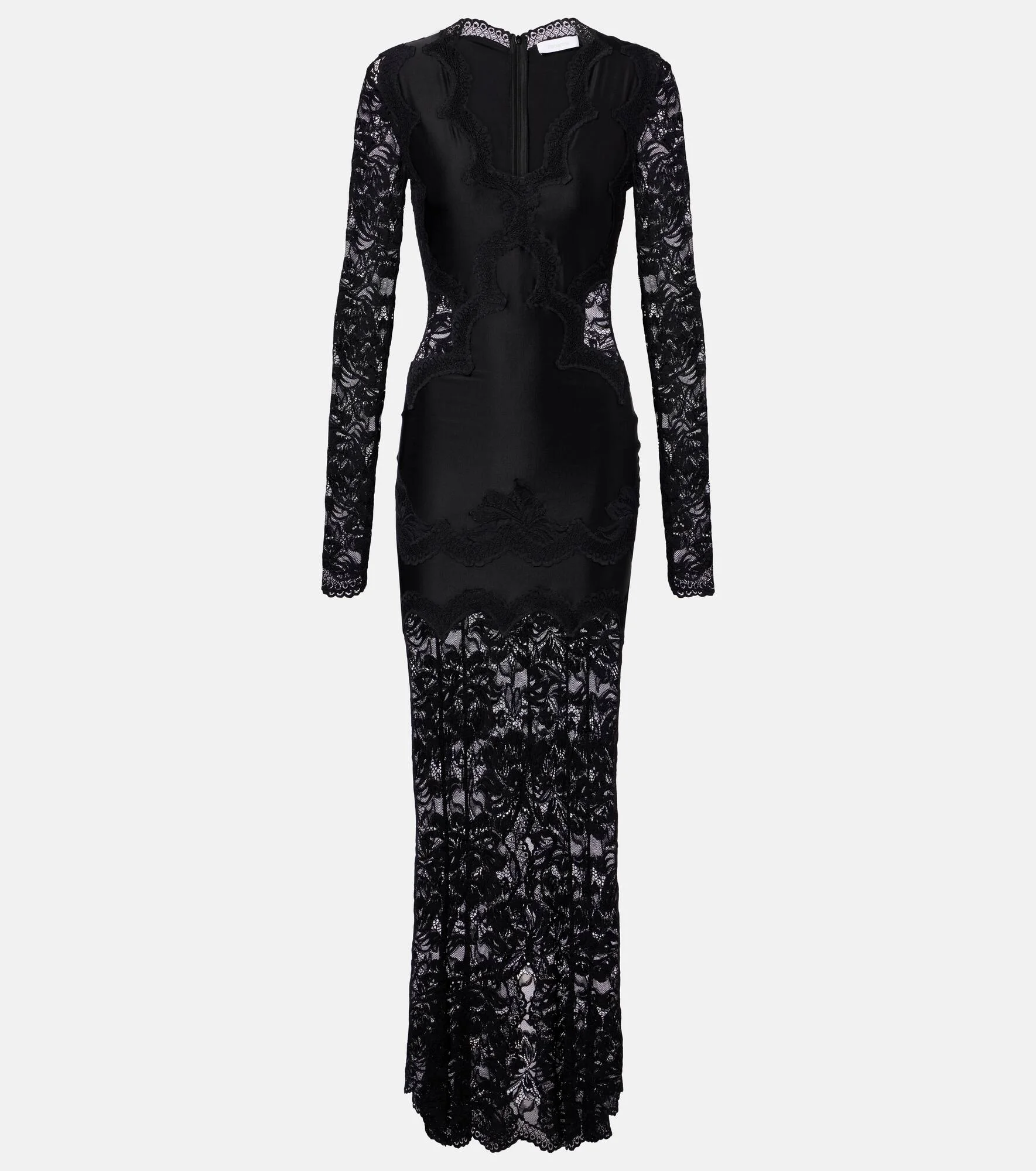 Celebrated for creating glamorous designs with unexpected materials, Rabanne’s innovative spirit continues to break boundaries. This fluid jersey dress features a semi-sheer design and is detailed with stretch lace trims and a low neckline. Product Details - Material: 64% polyamide, 25% viscose, 10% elastane, 1% polyester - Care instructions: dry clean - Made in Poland - Designer color name: Black - Item color: black - Closure: zipped back - Short vent - Item number: P01115702 Size & Fit - True to size - Semi-sheer - Fitted - Slightly stretchy fabric - The model seen in the picture is 178cm-5'10" and wearing a size FR 34