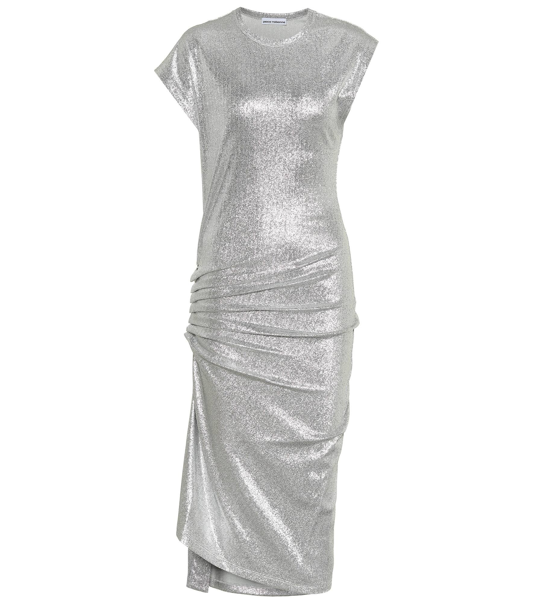 Sparkle through the night in this silver-toned dress from Paco Rabanne. With a figure-framing silhouette created with side-set gathering, this comfortable jersey style deserves a place in your evening edit. Style yours with barely there black sandals and one of the brand's chainmail bags. Product Details - Care instructions: hand wash - Material: 5% elastane, 20% polyester, 75% viscose - Made in Portugal - Item number: P00438149 Size & Fit - True to size - Fitted - Lightweight material - The model seen in the picture is 178cm-5'10" and wearing a size FR 36