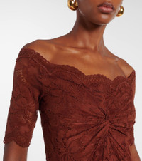 Celebrated for creating glamorous designs with unexpected materials, Rabanne’s innovative spirit continues to break boundaries. This maxi dress is made from lace to an off-shoulder silhouette with a gathered detail at the chest. Product Details - Material: 90% polyamide, 10% elastane - Care instructions: machine wash at 30 degrees - Made in Tunisia - Designer color name: Cinnamon Brown - Item color: brown - Collar: V-neck - Partially lined - Hem: scalloped - Item number: P01092755 Size & Fit - True to size - Off-the-shoulder - Cinched waist - Slightly stretchy fabric - The model seen in the picture is 178cm-5'10" and wearing a size FR 34