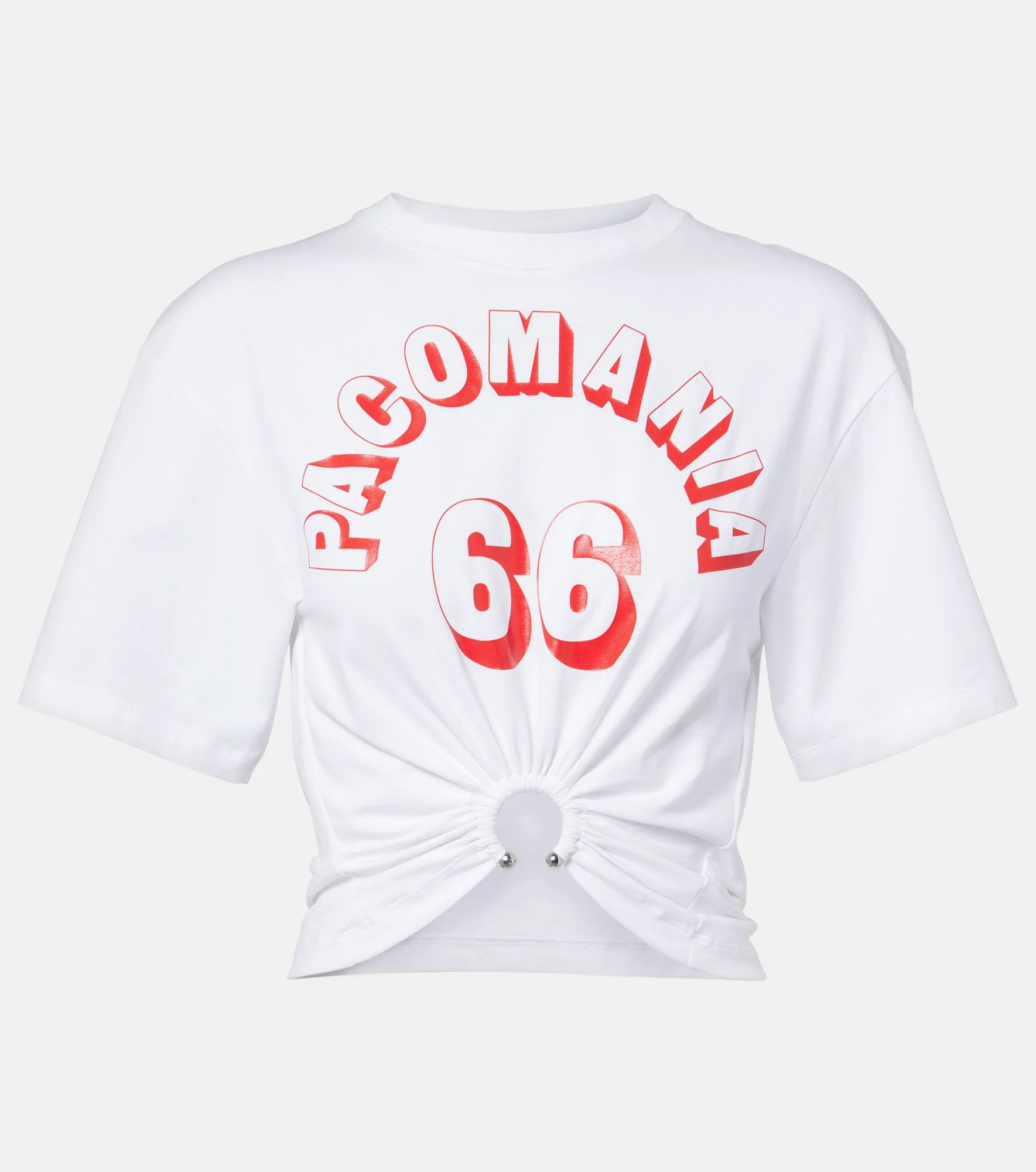 Rabanne’s innovative spirit continues to break boundaries. This printed T-shirt is crafted from cotton-blend jersey and features a crewneck and a cropped silhouette, defined by the signature silver-tone piercing. Product Details - Material: 91% cotton, 9% elastane - Care instructions: dry clean - Made in Portugal - Color: white - Designer color name: White - Item color: white, red - Hardware color: silver - Item number: P01115788 Size & Fit - True to size - Dropped shoulders - Cinched waist - Slightly stretchy fabric - Cropped - The model seen in the picture is 178cm-5'10" and wearing a size XS