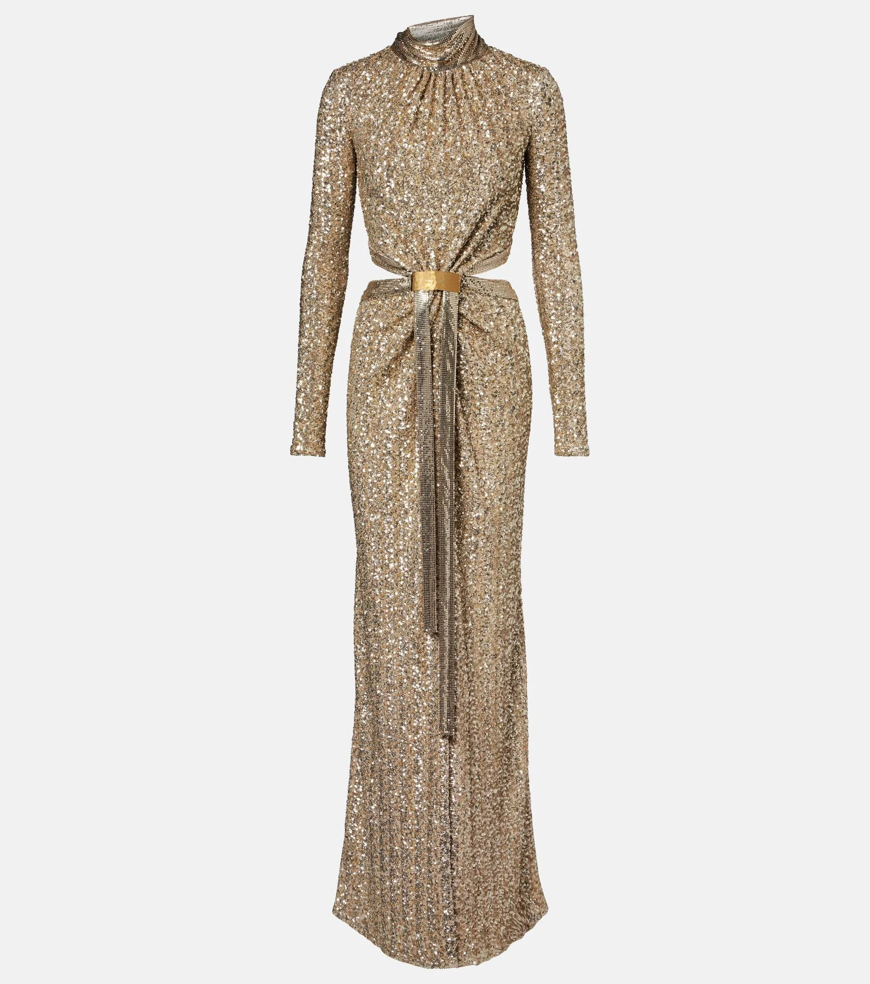Opulently embellished with all-over sequins, this gown by Rabanne is defined by signature chainmail accents at the scarf collar and gathered waist. The glamorous design is completed with a cutout detail at the waist and a deep side slit. Product Details - Material: 25% aluminum, 25% polyamide, 25% viscose, 25% polyester - Care instructions: dry clean - Made in Madagascar - Color: gold - Designer color name: Light Gold - Item color: gold - Closure: concealed zipped back - Long vent - Self-tie neck - Item number: P01115209 Size & Fit - True to size - Fitted - Non-stretchy fabric - The model seen in the picture is 178cm-5'10" and wearing a size FR 34