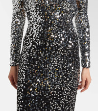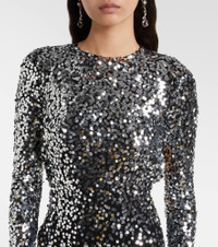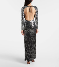 Celebrated for creating glamorous designs with unexpected materials, Rabanne’s innovative spirit continues to break boundaries. This long-sleeved jersey gown is embellished with dazzling sequins and is complete with an open back for a captivating finish. Product Details - Material: 90% cupro, 10% elastane - Care instructions: hand wash cold - Made in Portugal - Designer color name: Black - Item color: black, silver - Lining: 90% polyamide, 10% elastane - Self-tie collar - Item number: P01092758 Size & Fit - True to size - Low back - Fitted - Slightly stretchy fabric - The model seen in the picture is 178cm-5'10" and wearing a size FR 34