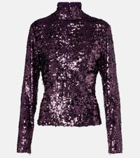 Celebrated for creating glamorous designs with unexpected materials, Rabanne’s innovative spirit continues to break boundaries. This top features all-over sequins, a high neck, and long sleeves. Product Details - Material: 100% polyester - Care instructions: hand wash - Made in Madagascar - Designer color name: Beetroot Purple - Item color: purple - Lining: 100% polyester - Closure: zip and button fastening - Item number: P01092752 Size & Fit - True to size - Fitted - Non-stretchy fabric - Falls to the hip - Height of model is 173cm-68" and wears a size FR 36