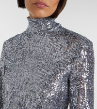 Celebrated for creating glamorous designs with unexpected materials, Rabanne’s innovative spirit continues to break boundaries. This top is adorned with all-over sequins and is finished with a mock neckline. Product Details - Material: 100% polyester - Care instructions: dry clean - Made in Madagascar - Designer color name: Silver - Item color: silver - Material II: 100% polyester - Closure: invisible zipper - Item number: P01058776 Size & Fit - True to size - Fitted - Slightly stretchy fabric - Falls to the hip - The model seen in the picture is 178cm-5'10" and wearing a size FR 34