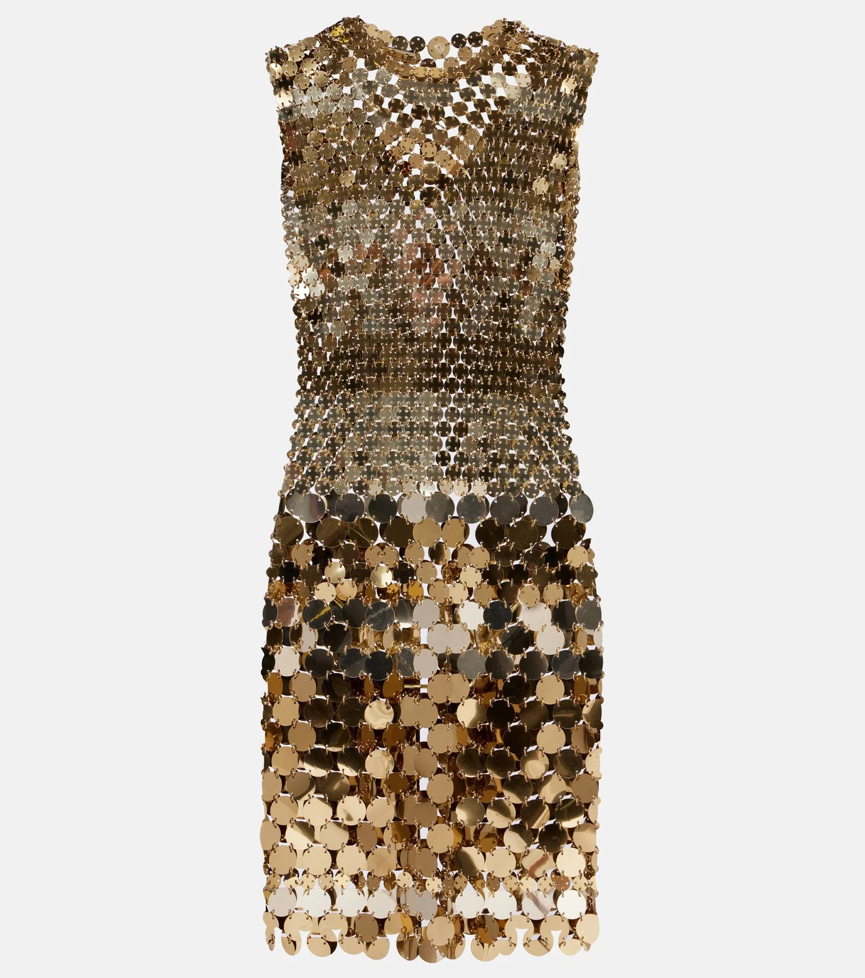Celebrated for creating glamorous designs with unexpected materials, Rabanne’s innovative spirit continues to break boundaries. The Sparkle Discs minidress is crafted from a network of mirrored gold-tone discs and rings, completed with snap-button fastenings at the back. Product Details - Material: 80% polyester, 20% aluminum - Care instructions: specialist clean - Made in Madagascar - Color: gold - Designer color name: Antic Gold - Item color: gold - Closure: snap-buttoned fastenings - Item number: P01115182 Size & Fit - Fits small to size - we recommend trying one size larger - Semi-sheer - Cinched waist - Non-stretchy fabric - Falls below the hip - The model seen in the picture is 178cm-5'10" and wearing a size FR 36