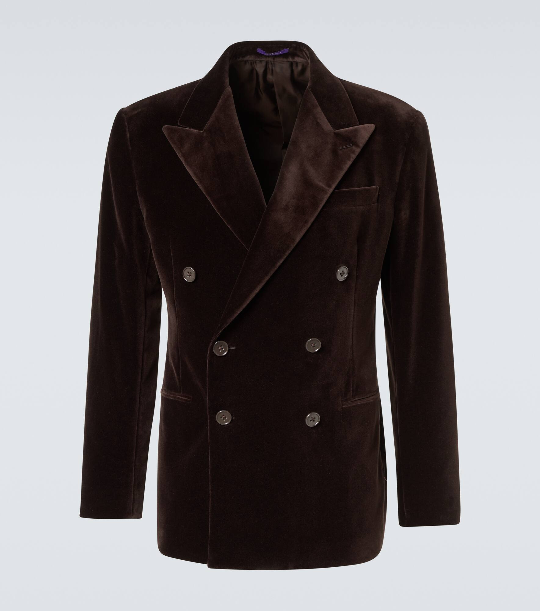 Crafted from luxurious materials, Ralph Lauren Purple Label’s elegant designs boast classic shapes and traditional tailoring. The Kent suit jacket is cut from cotton velvet to a double-breasted silhouette and detailed with a refined peak lapel. Product Details - Material: 100% cotton - Care instructions: dry clean - Made in Italy - Designer color name: Dark Luggage Brown - Item color: brown - Trim: 70% wool, 30% viscose - Lining: 100% cupro - Peak lapel - Pockets: ticket pocket, jetted, internal pockets - Fully lined - Item number: P01070258 Size & Fit - True to size - Shoulder pad inserts - Regular fit - Non-stretchy fabric - Falls below the hip - Height of model is 189cm-74.5" and wears a size UK 40
