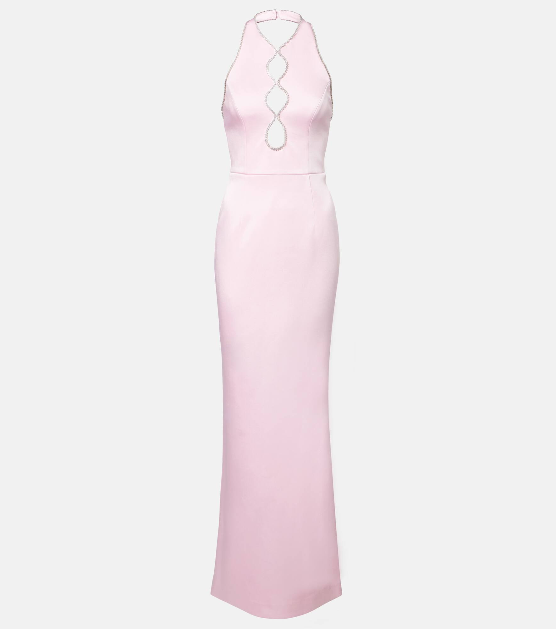 Every style from Rebecca Vallance is characterized by glitz and glamour. The Akari cutout satin gown has a halterneck and a low back. The fitted style is finished with a long vent and an invisible zipper. Product Details - Material: 57% polyester, 43% acetate - Care instructions: dry clean - Made in China - Designer color name: Pink - Item color: pink - Lining: 97% polyester, 3% elastane - Closure: invisible zipper - Long vent - Item number: P01096327 Size & Fit - True to size - Low back - Fitted - Non-stretchy fabric - slit length 67,0cm-26.5" - The model seen in the picture is 178cm-5'10" and wearing a size UK 6