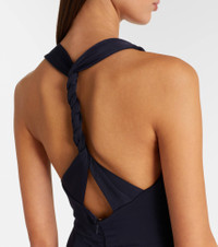 Eschew trends in favour of Rebecca Vallance’s timelessly elegant and effortlessly feminine designs. Complete with a gold-toned embellishment on the left shoulder strap, the Ayesha gown has a semi-open back with a braided strap hanging from the halter neckline. Product Details - Material: 78% polyester, 17% nylon, 5% elastane - Care instructions: dry clean - Made in Vietnam - Designer color name: Navy - Item color: blue - Lining: 95% polyester, 5% elastane - Closure: concealed zipped back - Long vent - Item number: P01129389 Size & Fit - True to size - Low back - Fitted - Slightly stretchy fabric - slit length 69cm-27" - The model seen in the picture is 178cm-5'10" and wearing a size UK 6