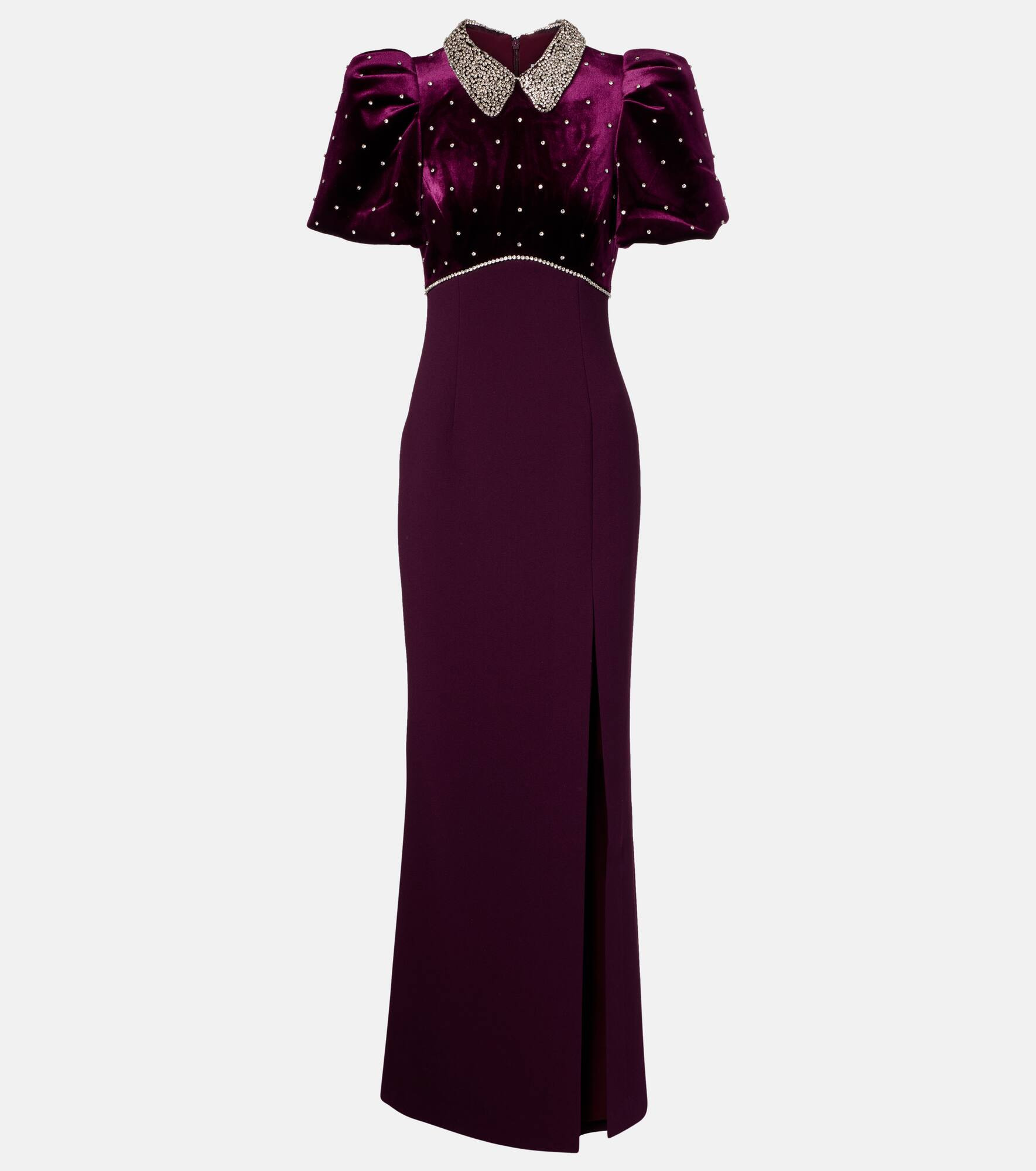 The Charles gown from Rebecca Vallance features a velvet bodice with an embellished collar for subtle sparkle. A fitted skirt with an alluring side slit completes the design, finished with a concealed back zip. Product Details - Material: 98% polyester, 2% elastane - Care instructions: dry clean - Made in China - Designer color name: Blackberry - Item color: purple - Lining: 97% polyester, 3% elastane - Material II: 93% polyester, 7% elastane - Closure: concealed zipped back, hook-fastening back - Side slits - Item number: P01118472 Size & Fit - True to size - Oversized shoulders - Fitted - Non-stretchy fabric - The model seen in the picture is 178cm-5'10" and wearing a size UK 6