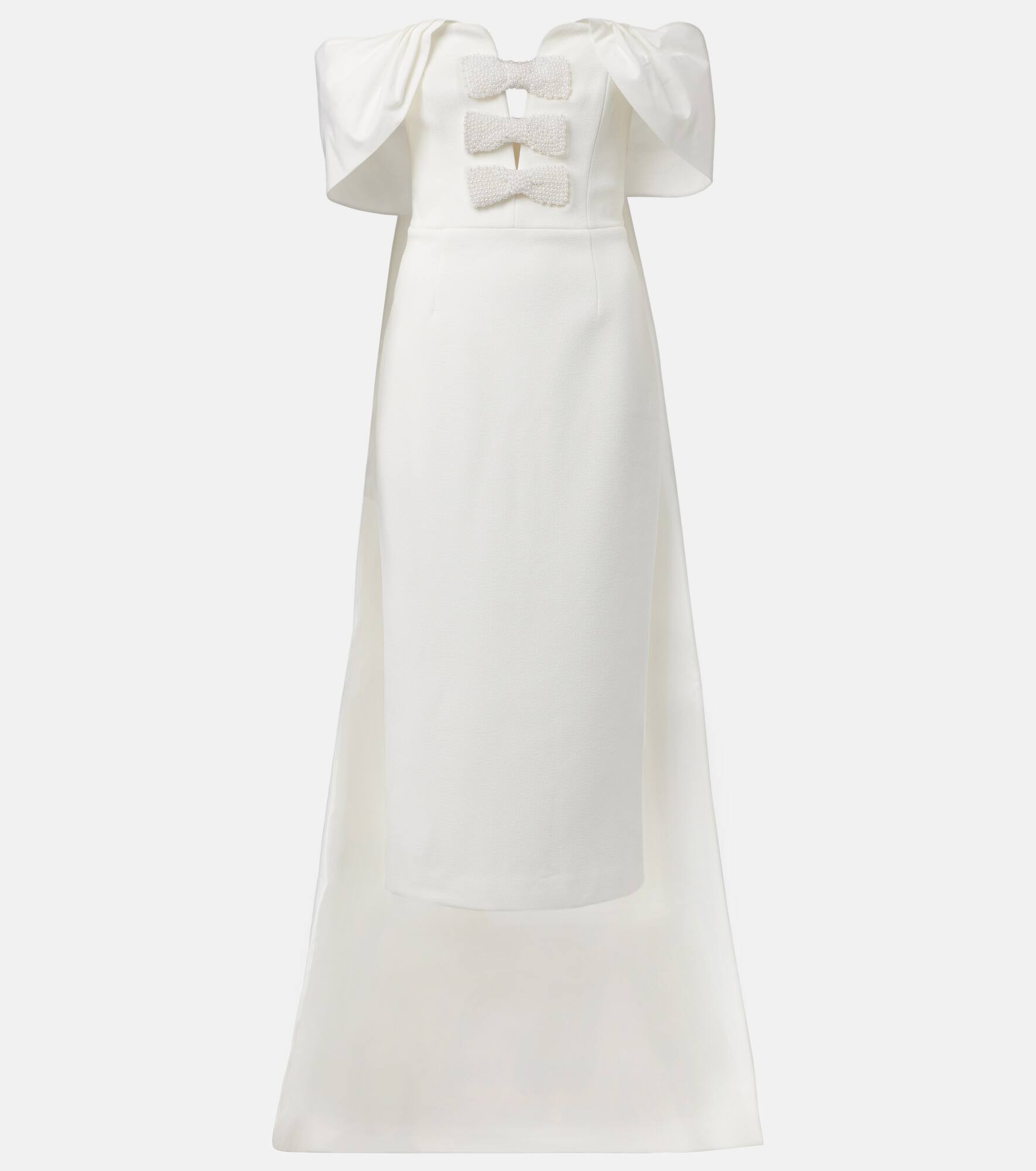 Product Details - Material: 98% polyester, 2% elastane - Care instructions: dry clean - Made in China - Designer color name: Ivory - Item color: ivory - Insert: 100% polyester - Item number: P01039623 Size & Fit - True to size - Off-the-shoulder - Internal laced corset for support - Fitted - Loose outer layer - Non-stretchy fabric - slit length 37cm-14.5" - The model seen in the picture is 178cm-5'10" and wearing a size UK 6
