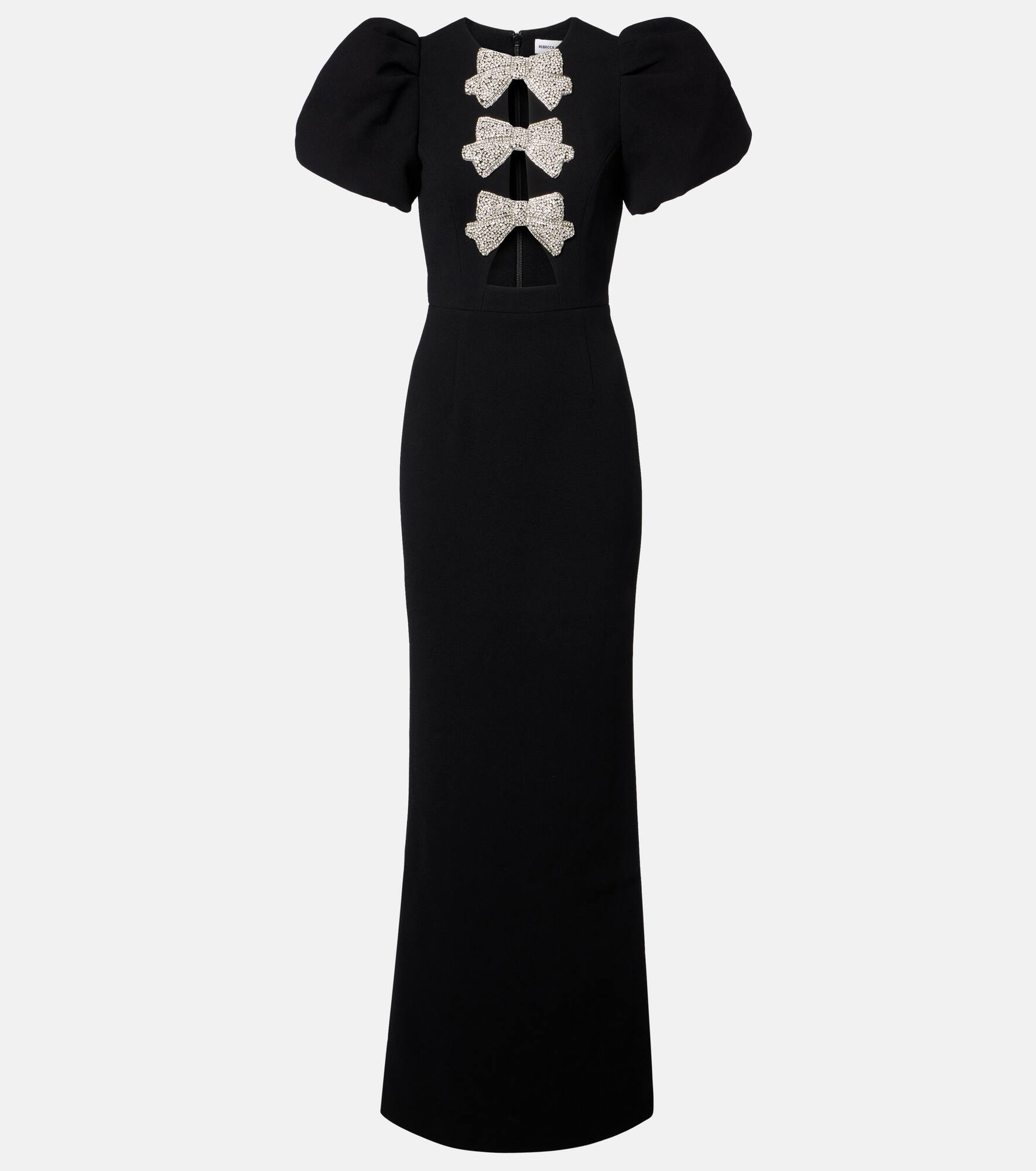 Every style from Rebecca Vallance is characterized by glitz and glamour. The Violetta gown stands out with its puffy sleeves, front cutouts, and sparkling embellished bow detailing. Product Details - Material: 98% polyester, 2% elastane - Care instructions: dry clean - Made in China - Designer color name: Black - Item color: black - Lining: 97% polyester, 3% elastane - Lining II: 100% polyester - Closure: zipped back - Long vent - Item number: P01096326 Size & Fit - True to size - Oversized shoulders - Fitted - Non-stretchy fabric - slit length 66cm-26" - The model seen in the picture is 178cm-5'10" and wearing a size UK 6