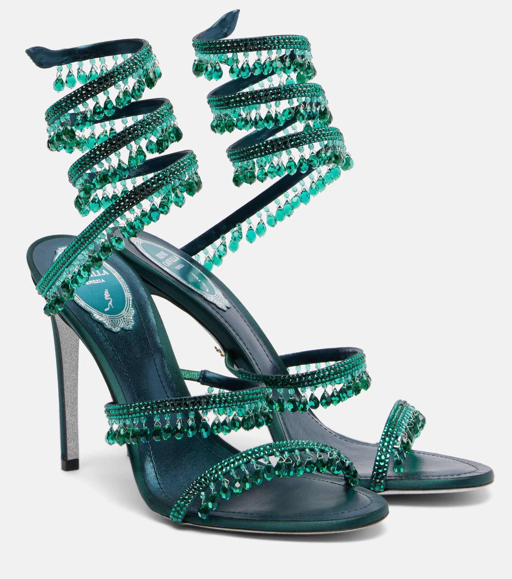 You’ll find myriad reasons to slip on a shimmering Rene Caovilla design well beyond cocktail hour. Italian-crafted from satin, the Chandelier sandals feature 105mm stiletto heels, dazzling embellishments, and sculptural straps. Product Details - Upper: fabric - Lining: leather - Sole: leather insole and sole - Toe shape: almond open toe - Made in Italy - Includes: shoe box, dust bag - Designer color name: Green/ Metallic Blue Strass - Item color: green - Closure: ankle strap - Item number: P01100776 Size & Fit - True to size - Slightly narrow calf - European sizes - 10,5cm-4" heel (size EU 38)