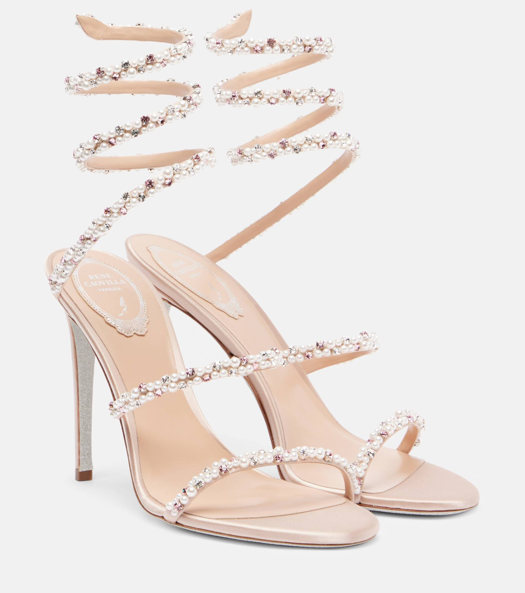One of the brand’s most iconic styles, the Cleo sandals from Rene Caovilla were exhibited at the MOMA in New York City. This satin pair features 105mm stiletto heels and is finished with a stunning pearl embellishment and snake ankle straps. Product Details - Upper: fabric - Lining: leather - Sole: leather insole, rubber sole - Toe shape: almond open toe - Made in Italy - Includes: shoe box, dust bag - Designer color name: Nude Satin/Cr-Rose Str-Prls - Item color: pink - Closure: ankle strap - Item number: P01044067 Size & Fit - True to size - European sizes - 10,5cm-4" heel (size EU 38)