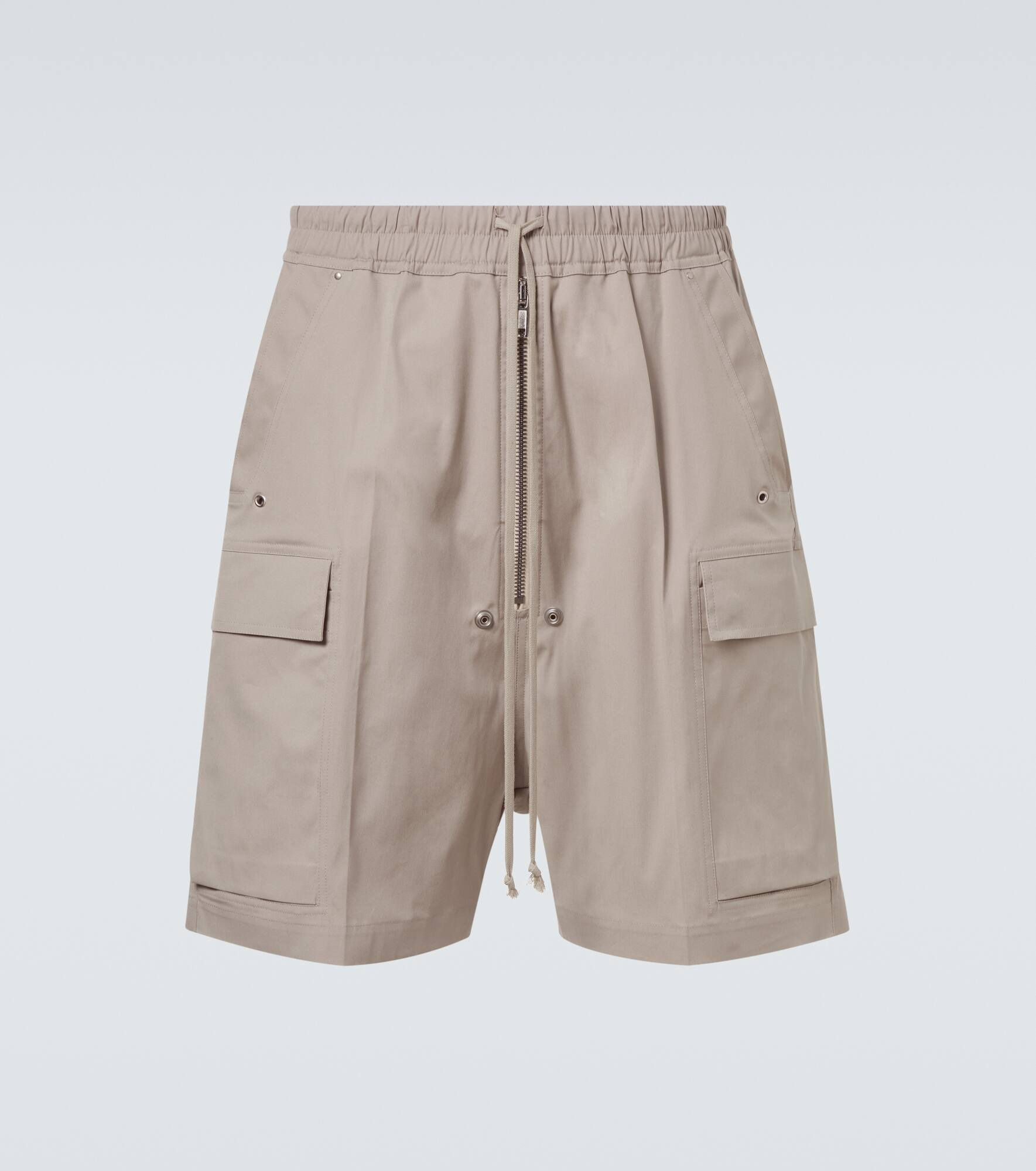 Rick Owens crafts these Cargobela shorts from crisp, washed cotton-blend poplin for a structured yet broken-in feel. The knee-length silhouette features a low crotch, wide leg, and sleek beveled cargo pockets. Product Details - Material: 97% cotton, 3% elastane - Care instructions: hand wash - Made in Italy - Designer color name: Pearl - Item color: beige - Elasticated drawstring waist - Pockets: slant pockets, buttoned pockets, back pockets - Closure: zipped front - Hardware color: silver - Item number: P01036902 Size & Fit - True to size - Elasticated waist - Adjustable at the waist - Non-stretchy fabric - Wide-leg - Low inseam - Height of model is 188cm-74" and wears a size 52