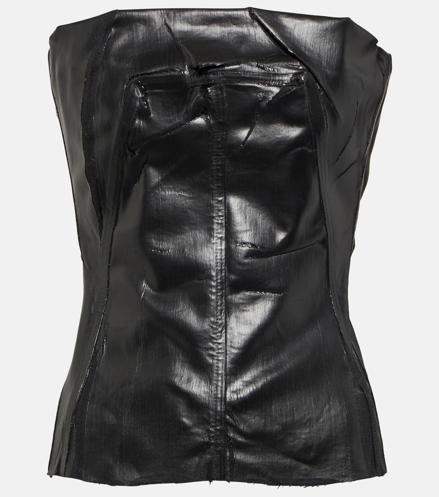 Aptly nicknamed The Lord of Darkness, Rick Owens brings gothic and industrial inspiration to avant-garde design. Made of black coated denim that lends the illusion of faux leather, this zip-back bustier has a paneled construction. Product Details - Material: 91% cotton, 6% elastane, 3% rubber - Care instructions: hand wash - Made in Italy - Designer color name: Black - Interlining: 78% polyamide, 22% elastane - Closure: zipped back - Item number: P00839011 Size & Fit - Fits small to size - we recommend trying one size larger - Strapless - Internal boned corset for support - Fitted - Mid-weight material - Falls to the hip - The model seen in the picture is 178cm-5'10" and wearing a size IT 42