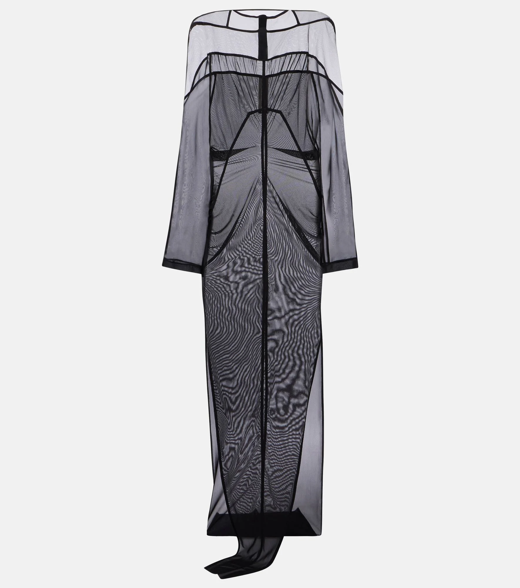 Aptly nicknamed The Lord of Darkness, Rick Owens brings gothic and industrial inspiration to avant-garde design. Crafted from semi-sheer tulle and chiffon, the Collage long-sleeved gown features a boat neckline and high side slits. Product Details - Material: 93% polyamide, 7% elastane - Care instructions: dry clean - Made in Italy - Color: black - Designer color name: Black - Material II: 100% polyamide - Material III: 100% silk - Closure: partially buttoned front - Side slits - Item number: P01137302 Size & Fit - True to size - Sheer - Cinched waist - Partly stretchy fabric - The model seen in the picture is 178cm-5'10" and wearing a size %size%