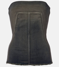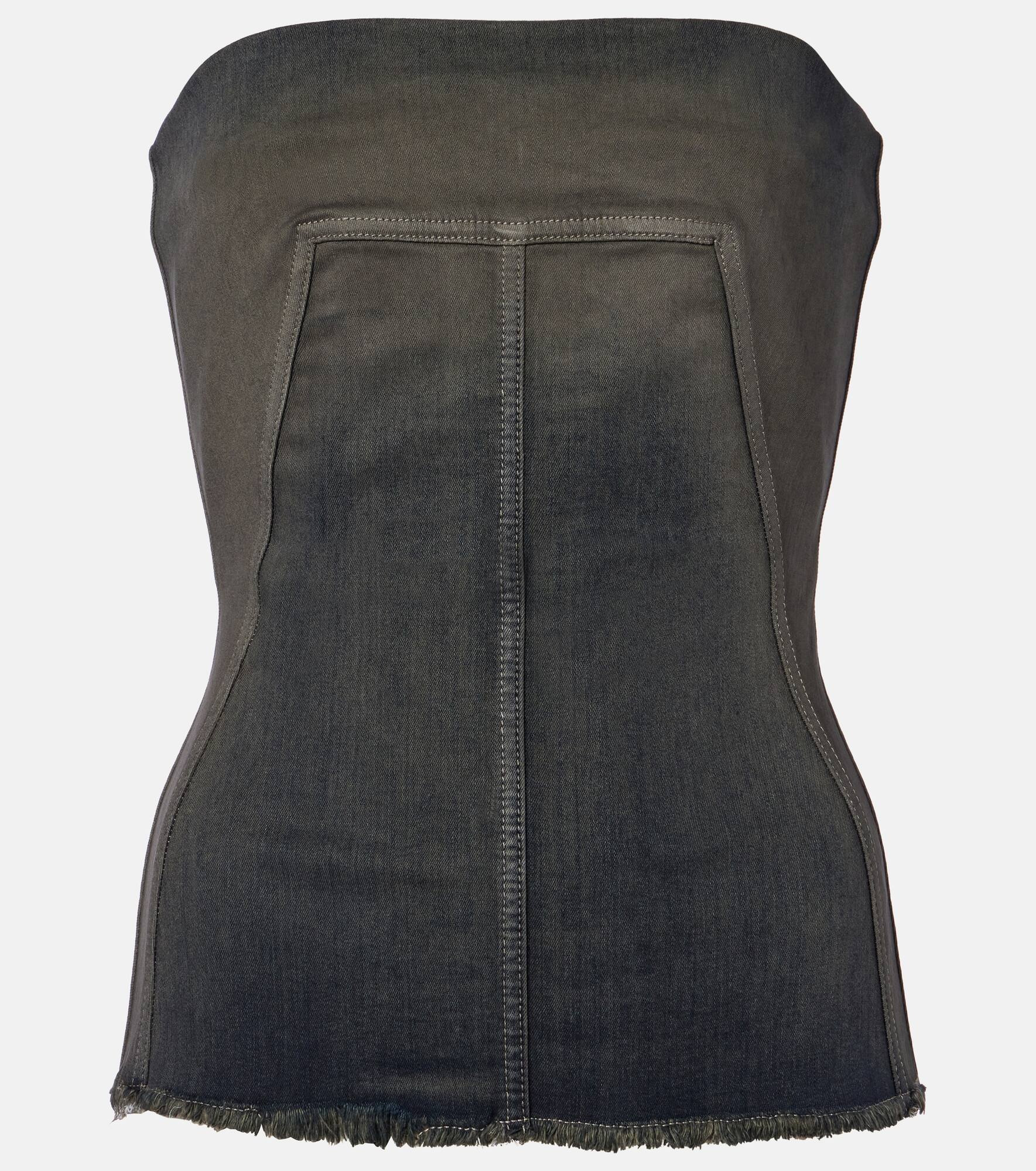 Aptly nicknamed The Lord of Darkness, Rick Owens brings gothic and industrial inspiration to avant-garde design. This denim corset is designed with a close-fitting, strapless silhouette, a raw hem, and the brand's signature seams. Product Details - Material: 91% cotton, 6% elastomultiester, 3% rubber - Care instructions: hand wash - Made in Italy - Designer color name: Drkdust Degrade - Item color: gray - Material II: 84% polyamide, 16% elastane - Built-in bustier - Boning - Closure: zipped back - Item number: P01068272 Size & Fit - True to size - Strapless - Fitted - Stretchy fabric - Falls below the hip - The model seen in the picture is 178cm-5'10" and wearing a size IT 40